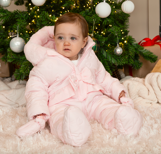 and toasty – it's the perfect opportunity to look absolutely adorable. Our baby girl range gives you the choice of frilly all-in-ones, jacquard jog sets, and heart-printed pinafores with long-sleeved tops. For days out exploring the snow, our pink snowsuits will come in handy.