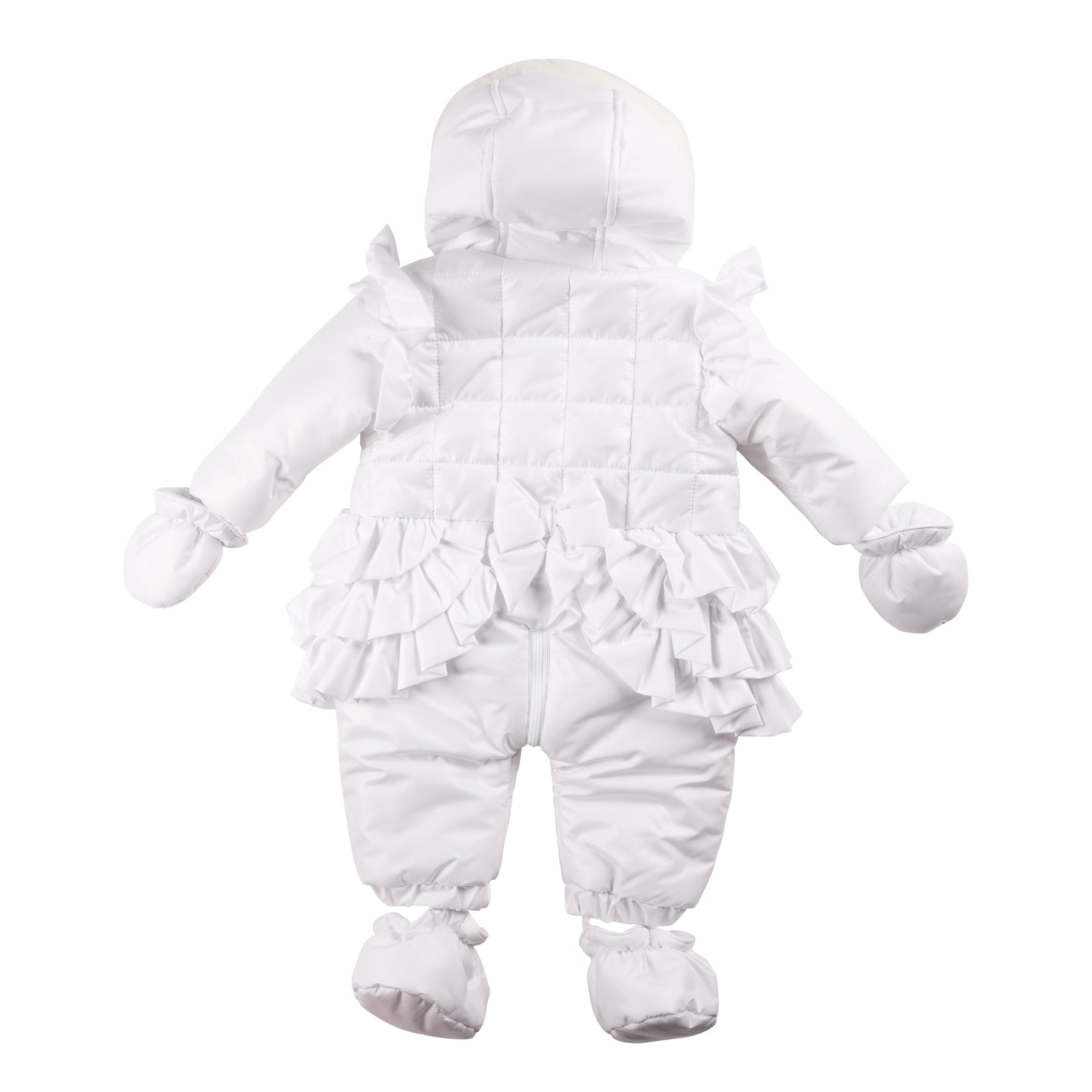 Introducing to the AW24 collection: a gorgeous Iridescent White Snowsuit, designed to keep your little one comfortable and snug outdoors. This snowsuit features elegant frill details around the waist and shoulders with a cute bow at the back. The luxurious faux fur collar provides extra warmth, while the diamond-studded logo adds a hint of sparkle. Enclosed hands and feet ensure complete protection from the cold. Available in sizes from baby to toddler, this snowsuit will keep your child looking fashionable all season long.
