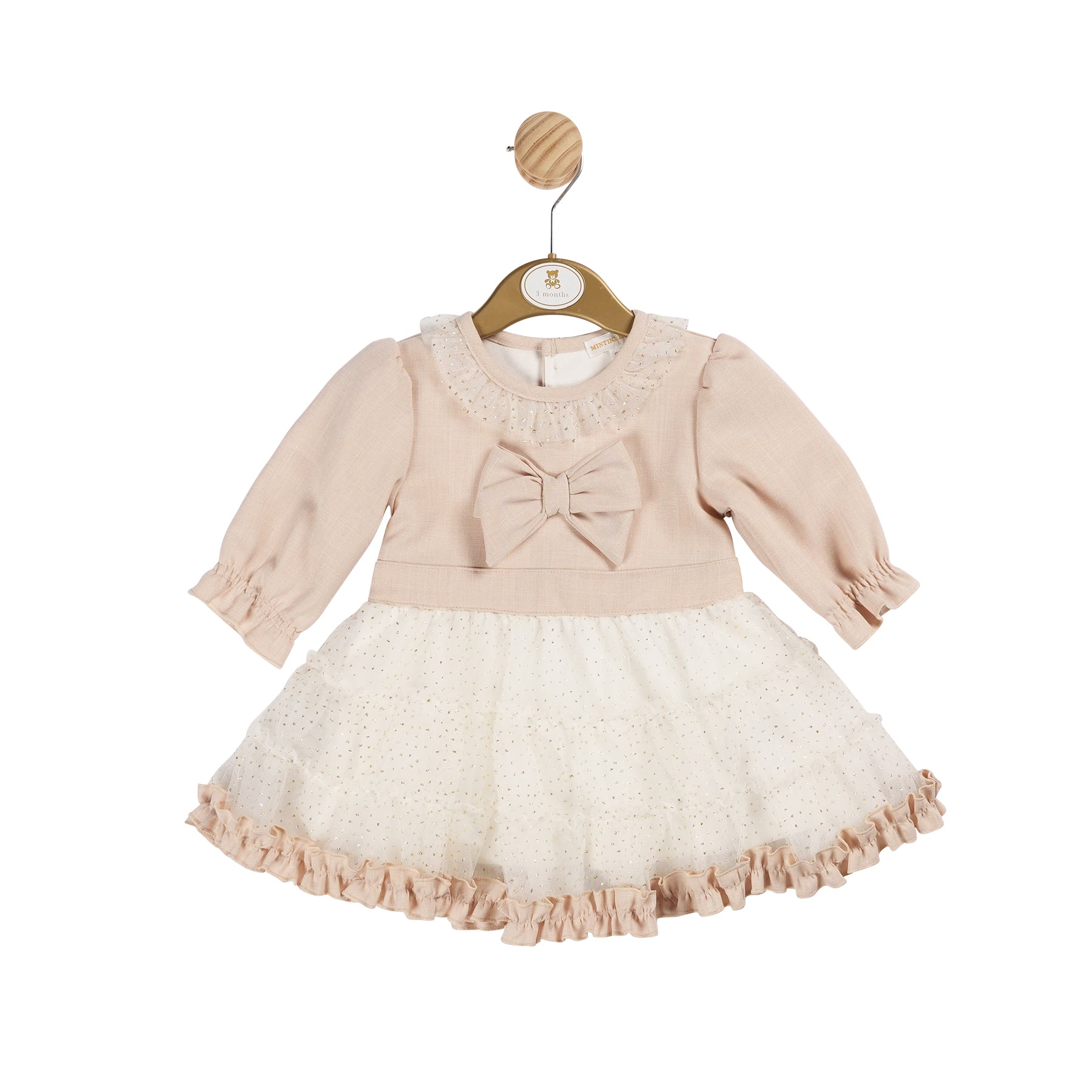 This charming Ivory Tulle Dress is perfect for your little one’s special occasions. Featuring a soft, long-sleeved knit bodice in a delicate beige tone, it’s adorned with an elegant bow at the chest for a sweet touch. The layered ivory tulle skirt adds a whimsical flair with subtle ruffles along the hem, creating a graceful and twirl-worthy silhouette. Comfortable and stylish, this dress blends classic charm with modern design—ideal for birthdays, family gatherings, or festive celebrations.