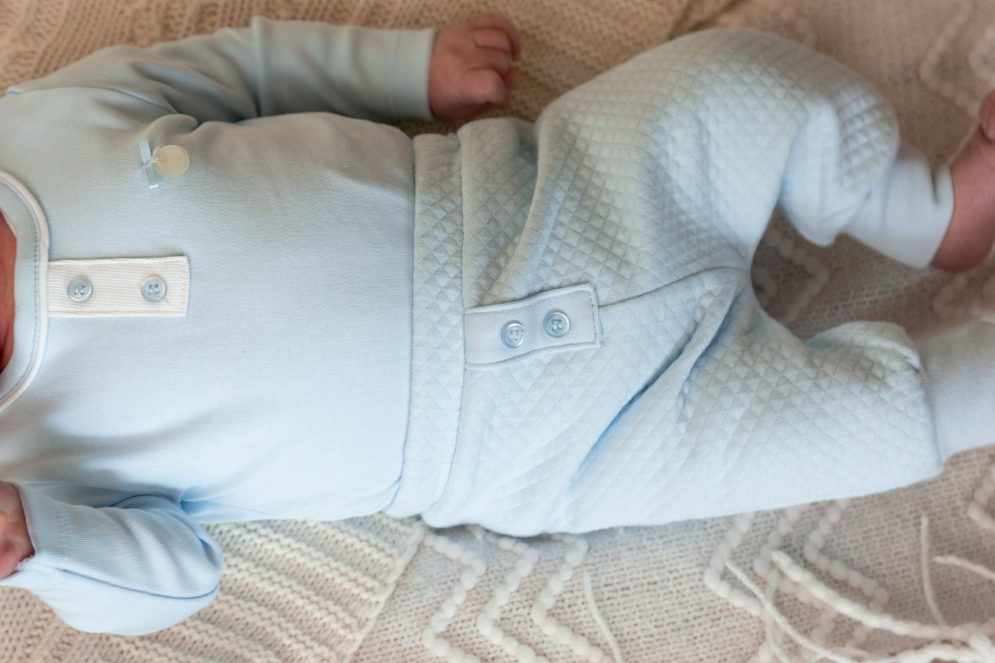 Introducing our Tiny Baby Collection. This blue bodysuit and waffle tracksuit pants ensemble has been designed with utmost care. It features convenient poppers on the bodysuit for easy dressing. Accompanied by a matching hat, this set is specially designed for delicate newborns and premature darlings. Available in sizes from 3-5lbs up to newborn. Crafted from a blend of 85% Cotton and 15% polyester, our garments ensure softness, comfort and durability for your little one. Our tiny baby collection is specially designed to keep little ones nice and snug from day one.