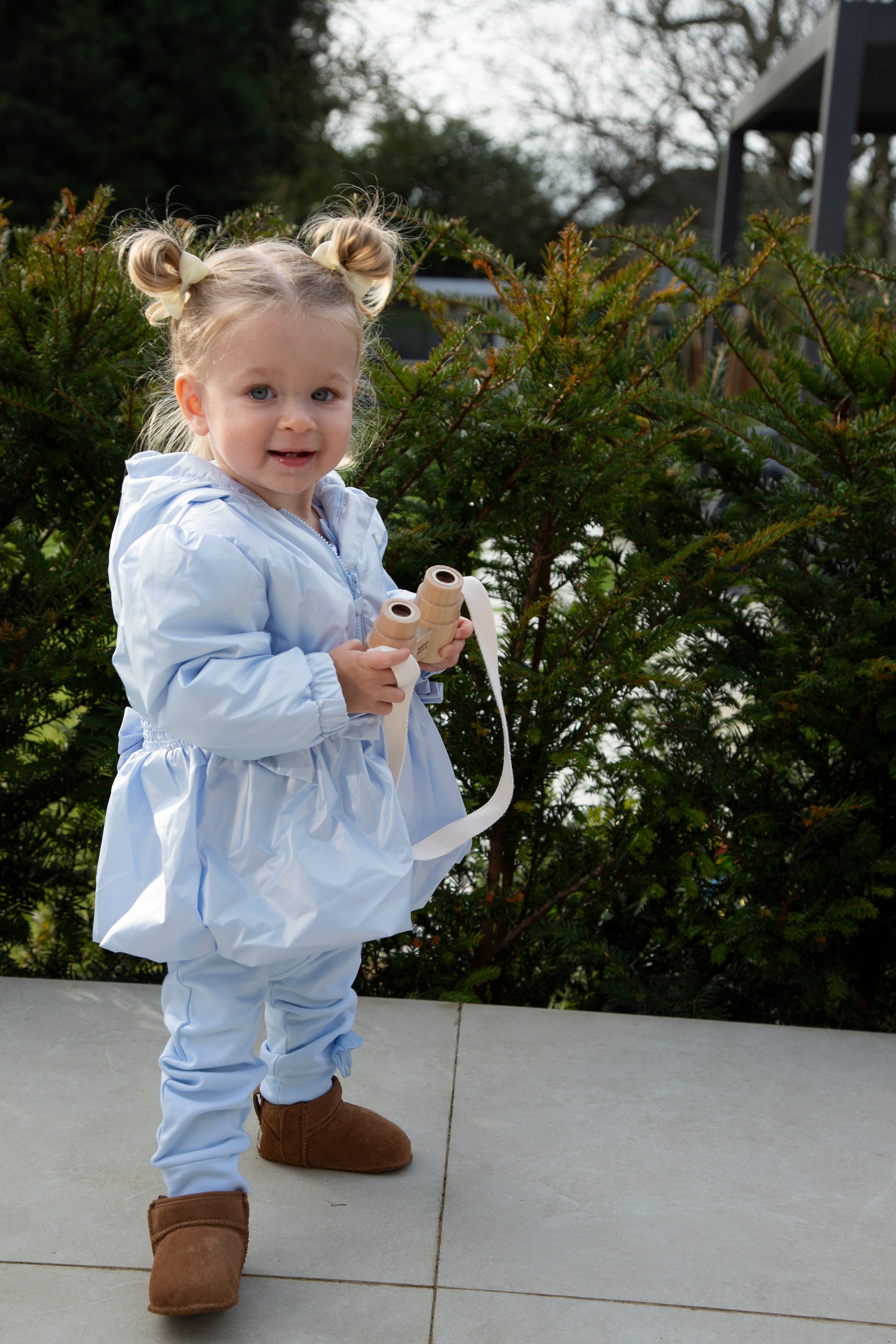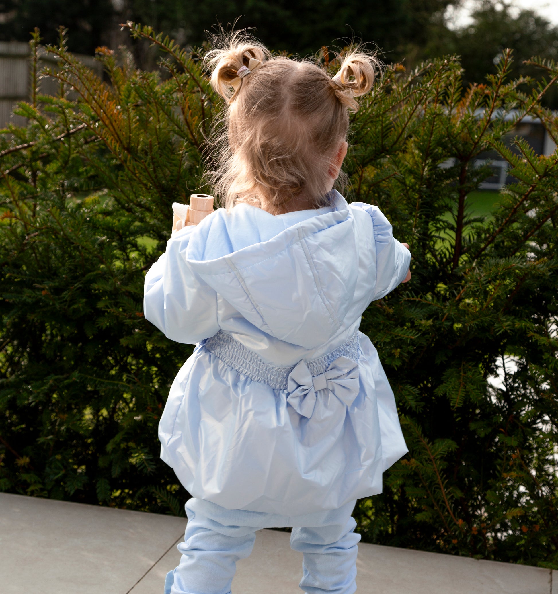 The Dolphin Blue Silky Jacket is a perfect addition to your little one’s summer wardrobe. In a soft baby blue, this lightweight puffer features a silky, iridescent sheen that adds a fresh, radiant touch. With cuffed sleeves and a cinched waist, it offers a sleek, flattering fit. The charming bows at the front and back add a playful, girly element. Ideal for breezy summer days, this jacket is a stylish yet lightweight option to keep them comfortable and looking cute
