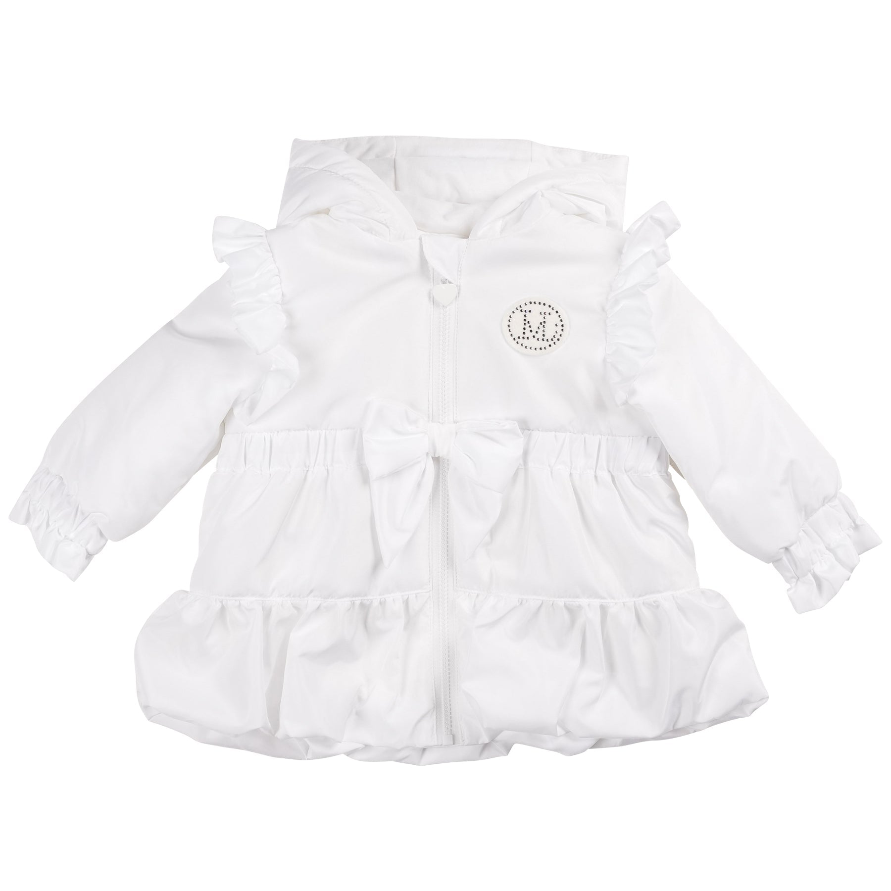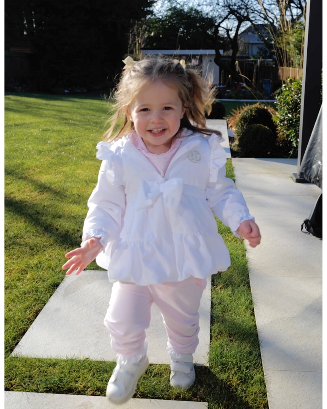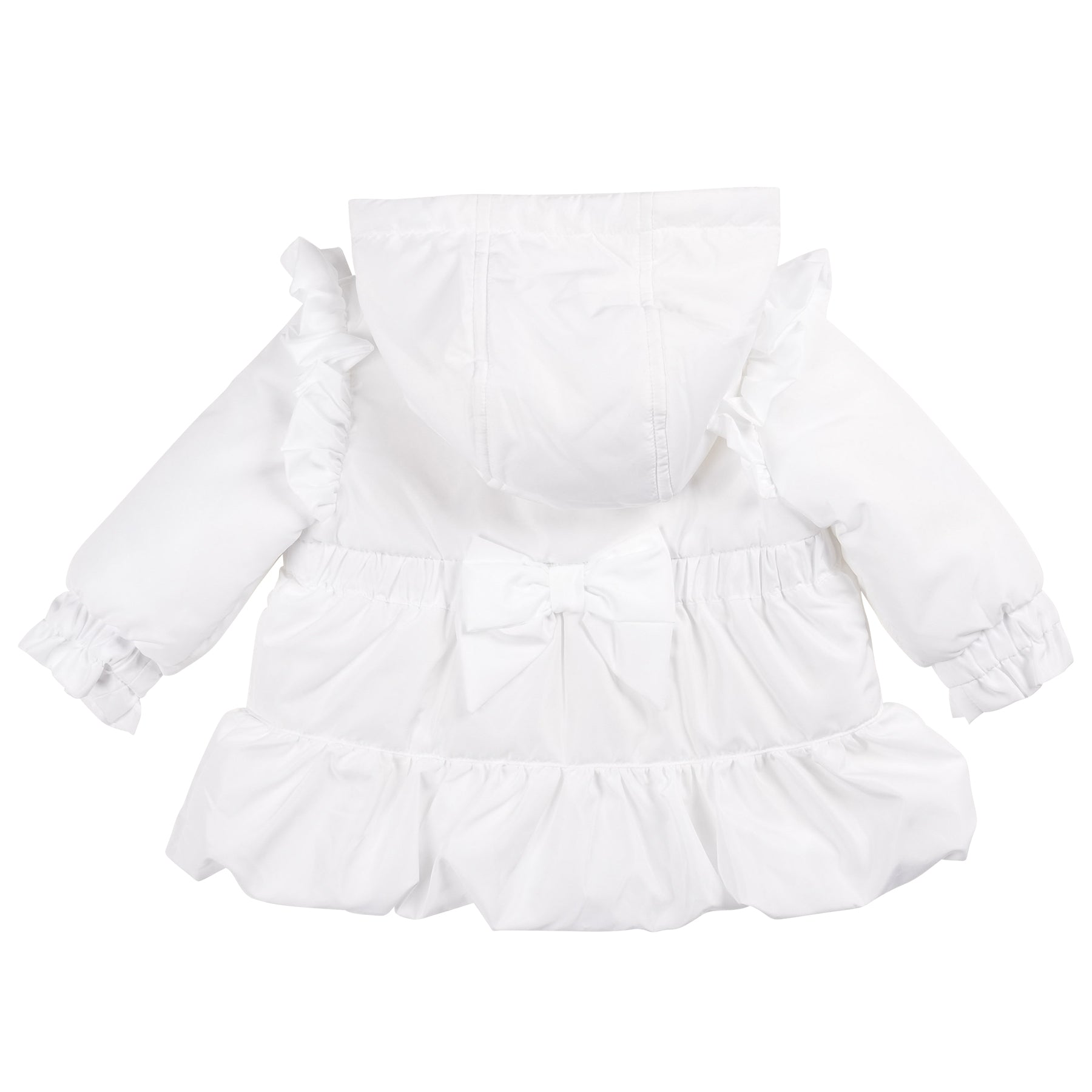 The Princess White Lightweight Jacket is a stylish summer piece featuring tiered pleating with horizontal seams, dividing the coat into three parts. It has cuffed sleeves, frilled shoulder seams, and a heart chain on the zip, adding a playful touch. Lightweight and elegant, this jacket is perfect for warm-weather outings.