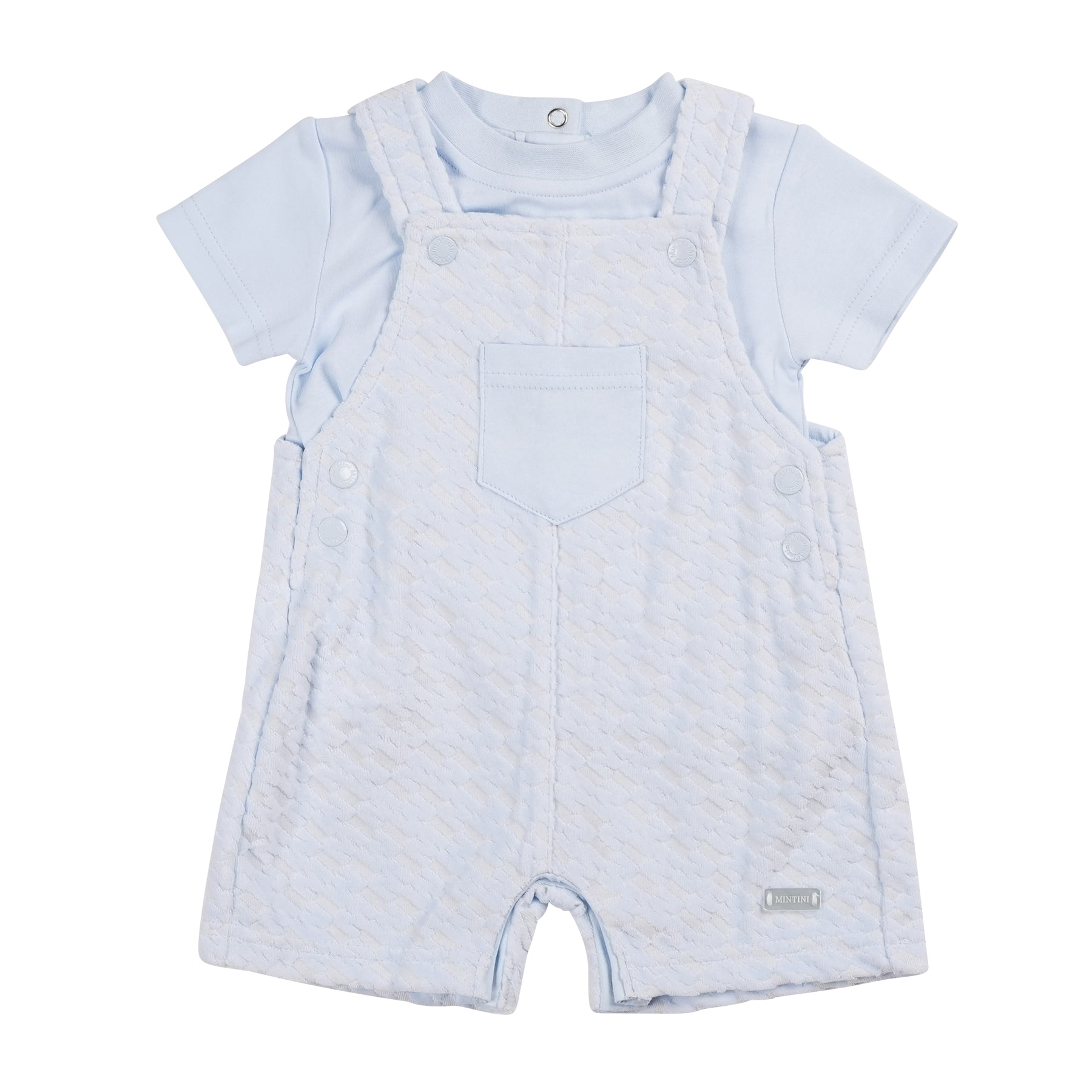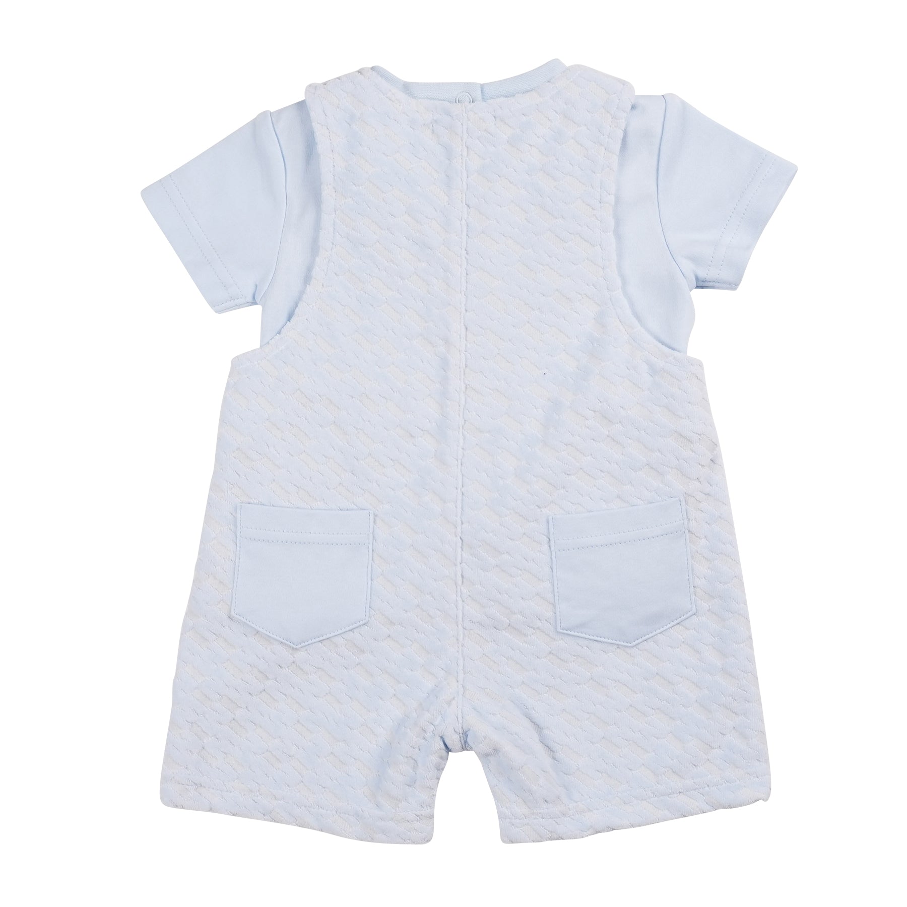 The Blue Velour Top & Short Dungaree is a sophisticated summer set for your little one. The soft short dungaree is crafted from baby blue velour with a subtle monogram texture, featuring a simple plain pocket at the centre for added charm. Paired with a matching plain baby blue t-shirt, the outfit creates a cohesive and stylish monochromatic look. Lightweight and breathable, this set is ideal for warm-weather outings, blending comfort and elegance effortlessly.