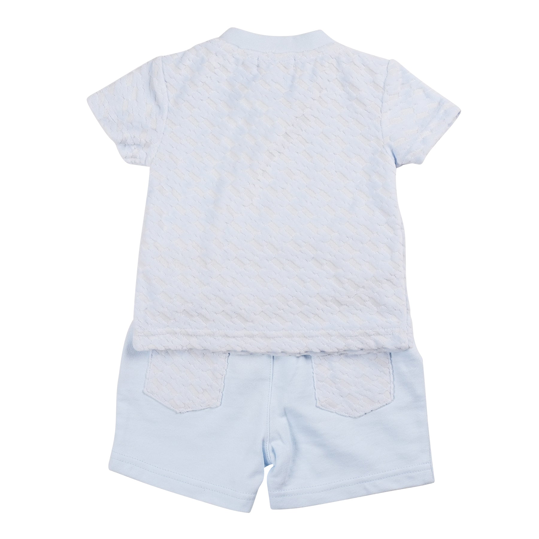 The Blue Velour Top & Short set is a perfect blend of style and comfort for sunny days. The baby blue t-shirt, crafted from soft velour with a subtle monogram texture, offers a touch of elegance. Paired with matching baby blue shorts featuring adorable back pockets in the same velour material, this outfit creates a cohesive and stylish look. Lightweight and breathable, this set ensures your little one stays comfortable and chic throughout the summer.