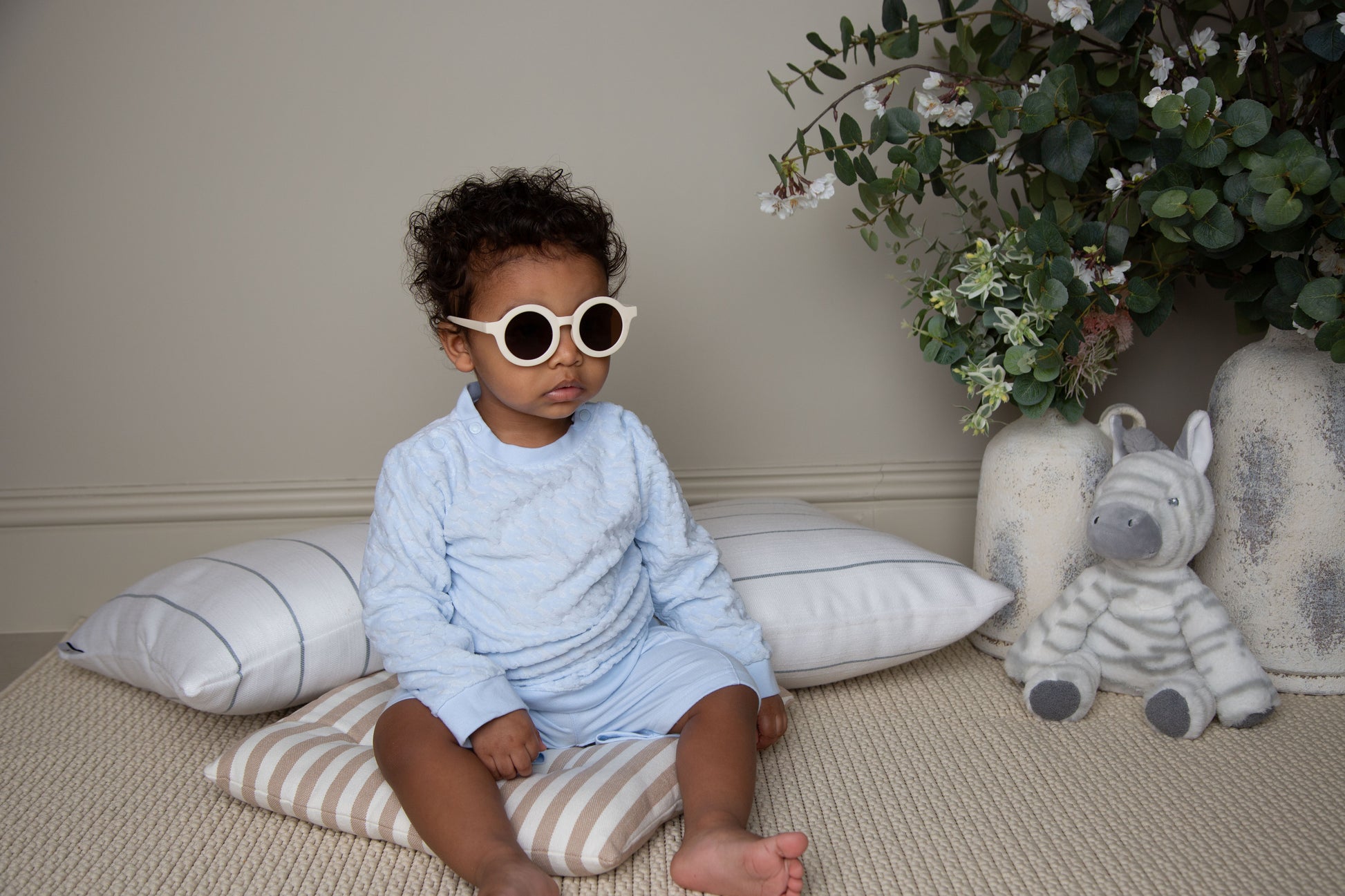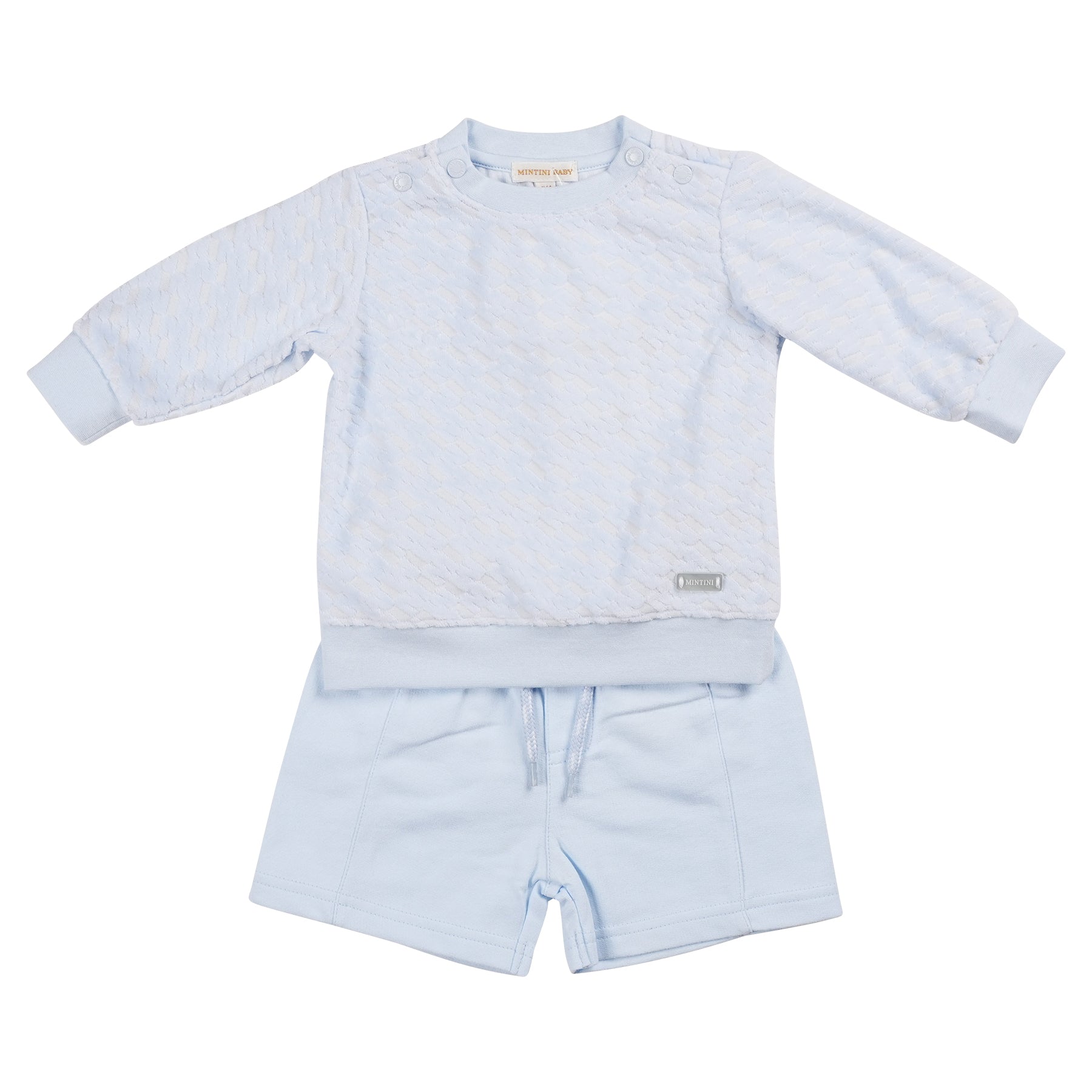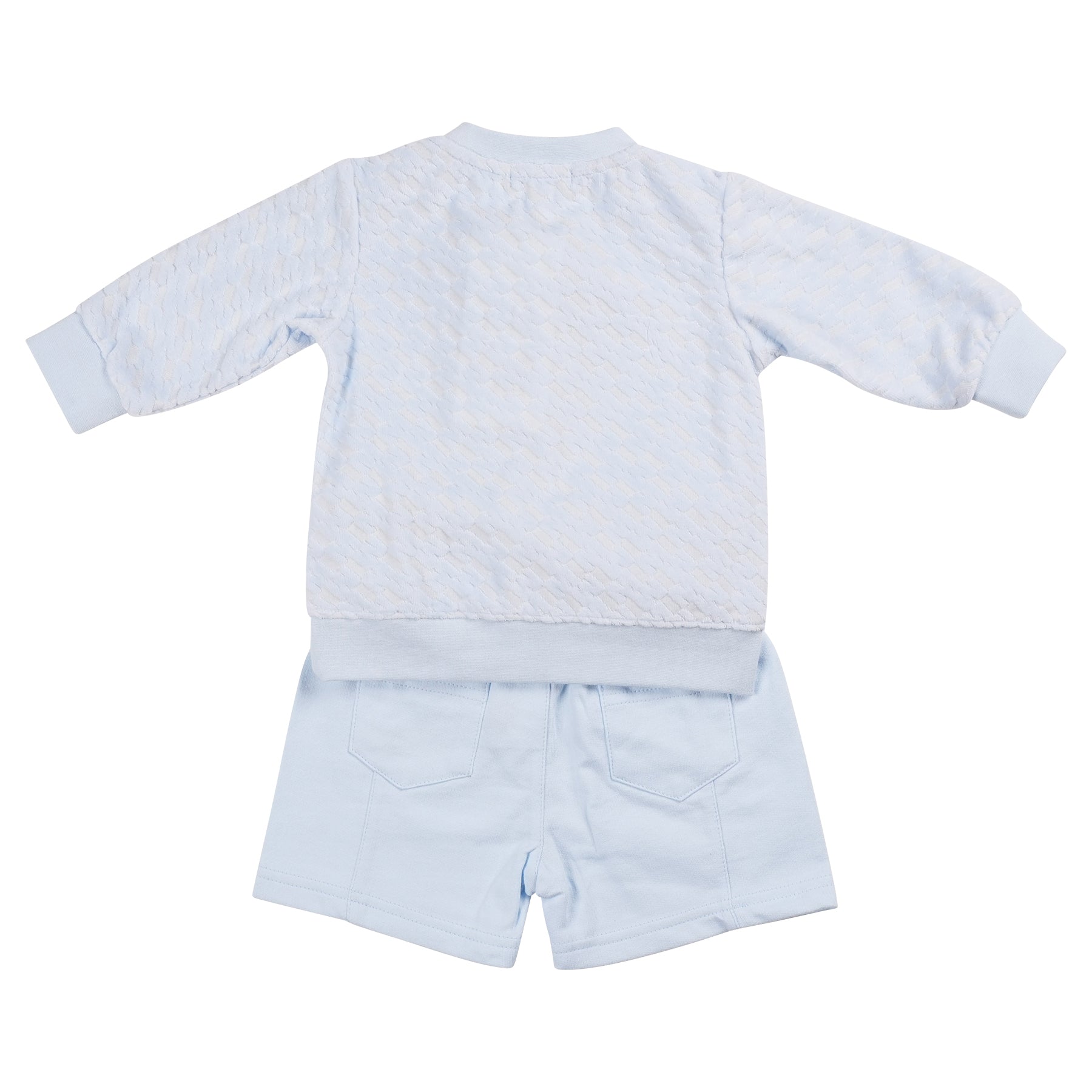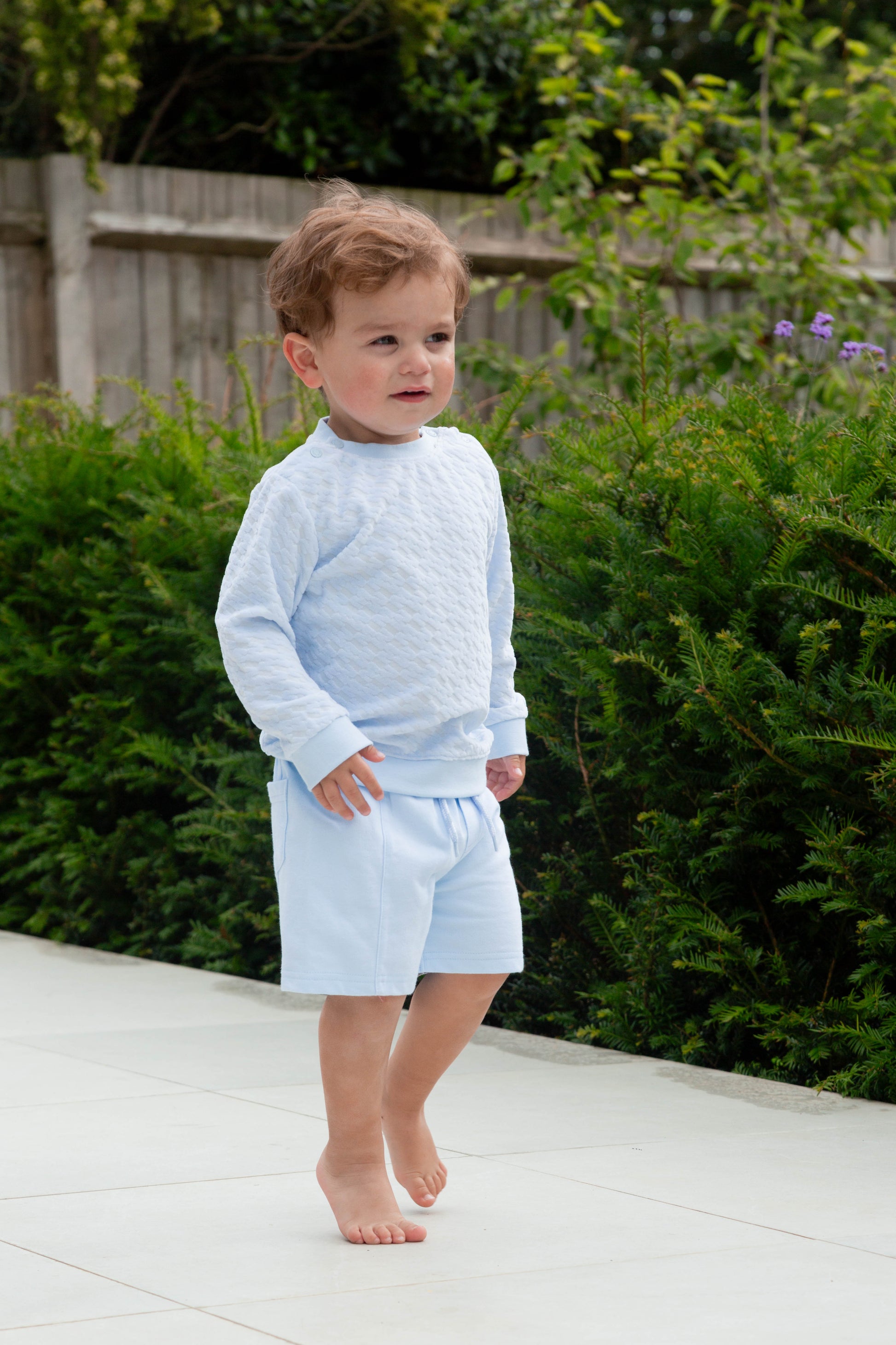 The Blue Velour Sweatshirt & Short set is perfect for breezy summer days, offering lightweight comfort with a touch of elegance. The long-sleeve t-shirt, crafted from soft baby blue velour with a subtle monogram texture, provides extra coverage without compromising breathability. Paired with matching baby blue shorts featuring adorable back pocket detailing, this set is both stylish and practical. Ideal for warm-weather outings, it’s a versatile outfit that keeps little ones looking effortlessly chic and feeling comfortable.