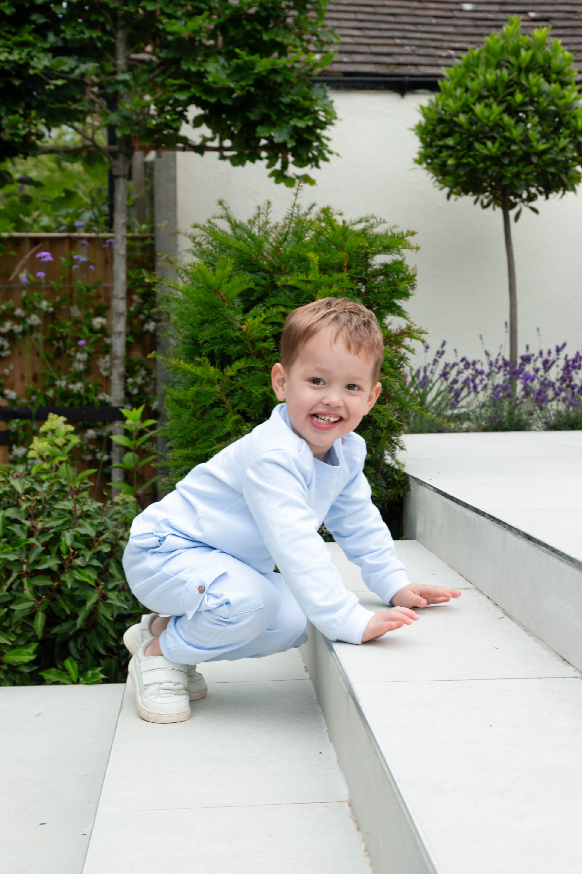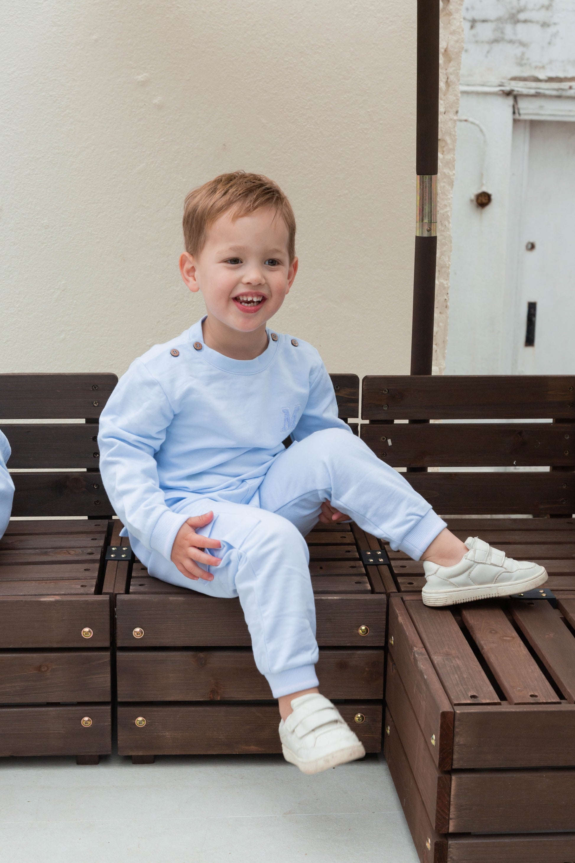 The Blue 2 Piece Jogset is perfect for keeping your little one comfortable on breezier summer days. Made from 100% soft cotton, it’s lightweight yet cozy. The long-sleeve top features wooden button detailing on the shoulders and a delicate embroidered blue 'M,' adding a playful touch. The matching joggers, complete with side pockets and ribbed cuffs, combine style and practicality. Ideal for outdoor adventures or relaxed days, this set offers effortless summer charm.