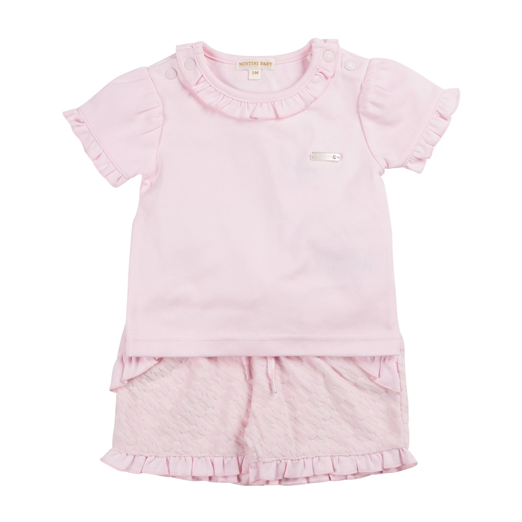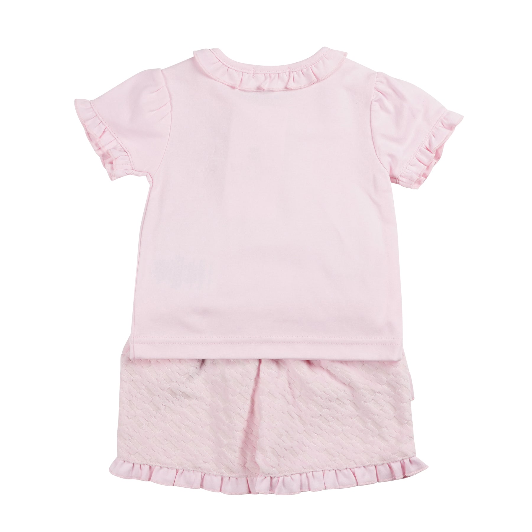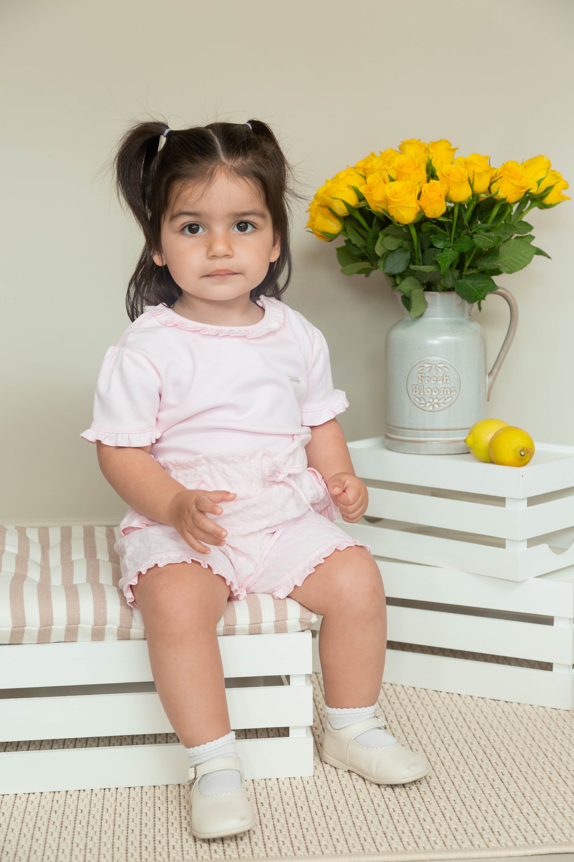 The Pink Velour Top and Short Set is a sweet and practical outfit for warm-weather days. The plain pink t-shirt features delicate frills around the collar and sleeves, adding a touch of charm. It’s paired with soft velour monogram shorts, designed with a comfortable drawstring waist for the perfect fit. Frill detailing around the bottom edge and pockets adds a playful finish to the design, making this set ideal for little ones to enjoy in style and comfort.