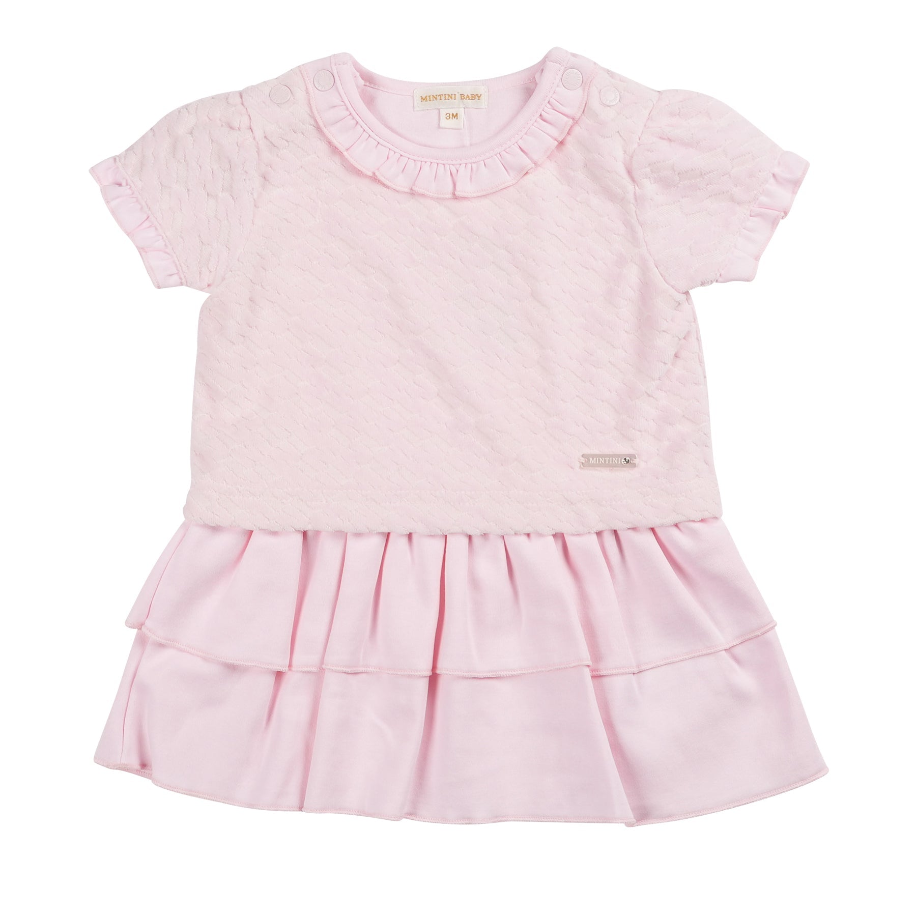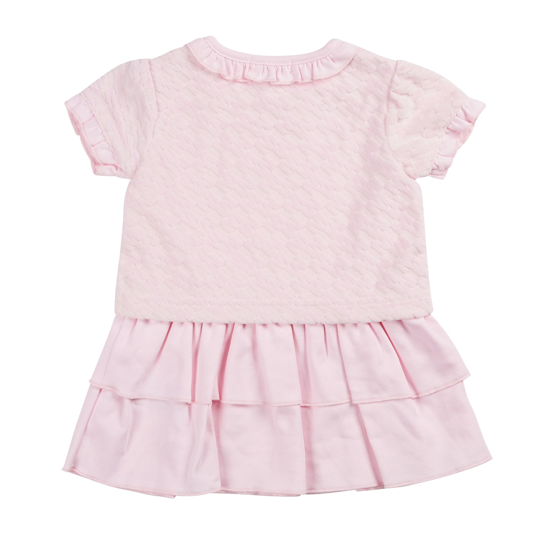 The Pink Velour Ra Ra Dress is a charming addition to any little one’s wardrobe. The top half features a soft velour monogram t-shirt with delicate frills trimming the collar and sleeves, bringing a touch of elegance. The bottom half is a playful plain pink ra ra skirt, crafted with two flowing tiers for a fun and breezy look. Perfect for summer outings, this dress combines comfort and style effortlessly for your little one.