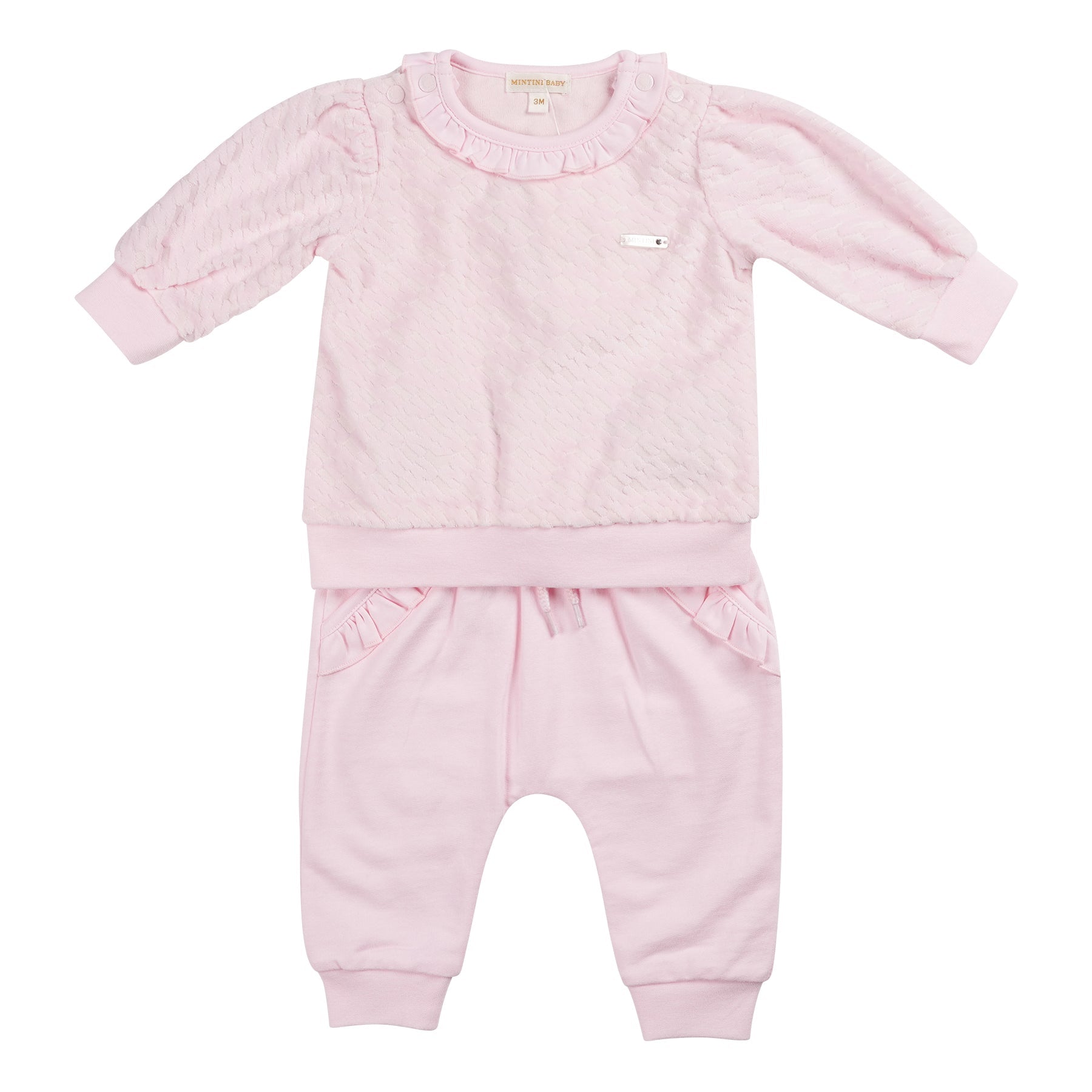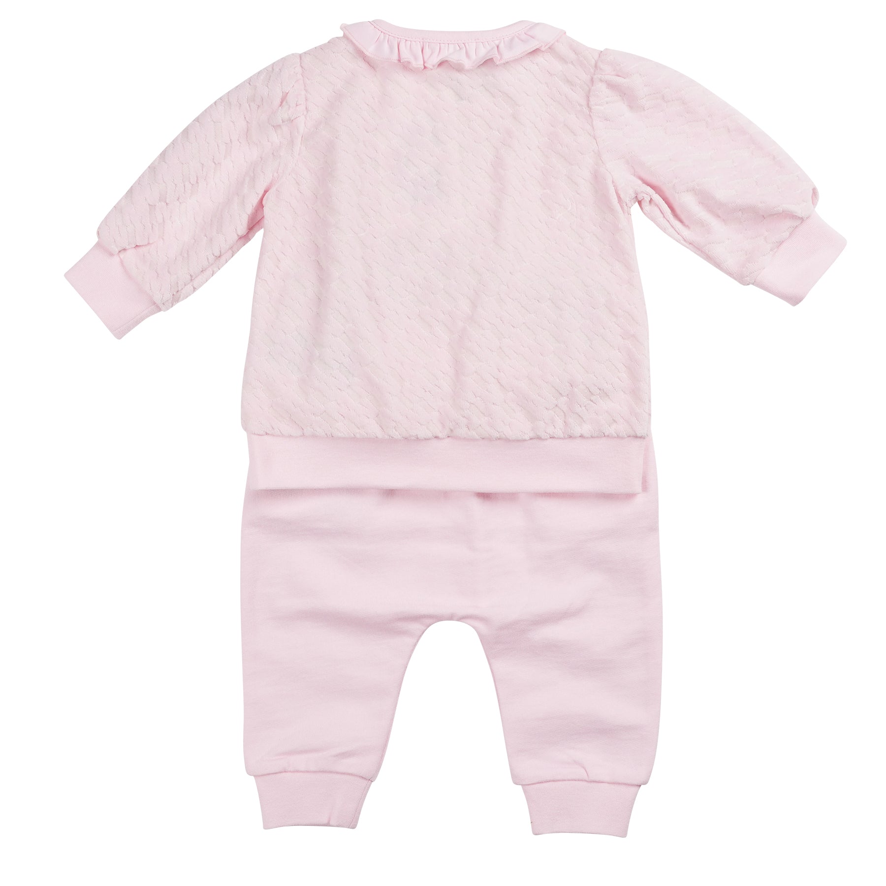 The 2 Piece Pink Velour Tracksuit Set is a lightweight and stylish option for summer days. The long-sleeve top is crafted from soft baby pink velour with a subtle monogram design, featuring cuffed sleeves, a cuffed waistband, and a delicate frill around the collar. The matching jogger bottoms are designed with a drawstring waist, cuffed legs, and frill detailing on the pockets for an adorable touch. This set perfectly combines comfort and charm for your little one.