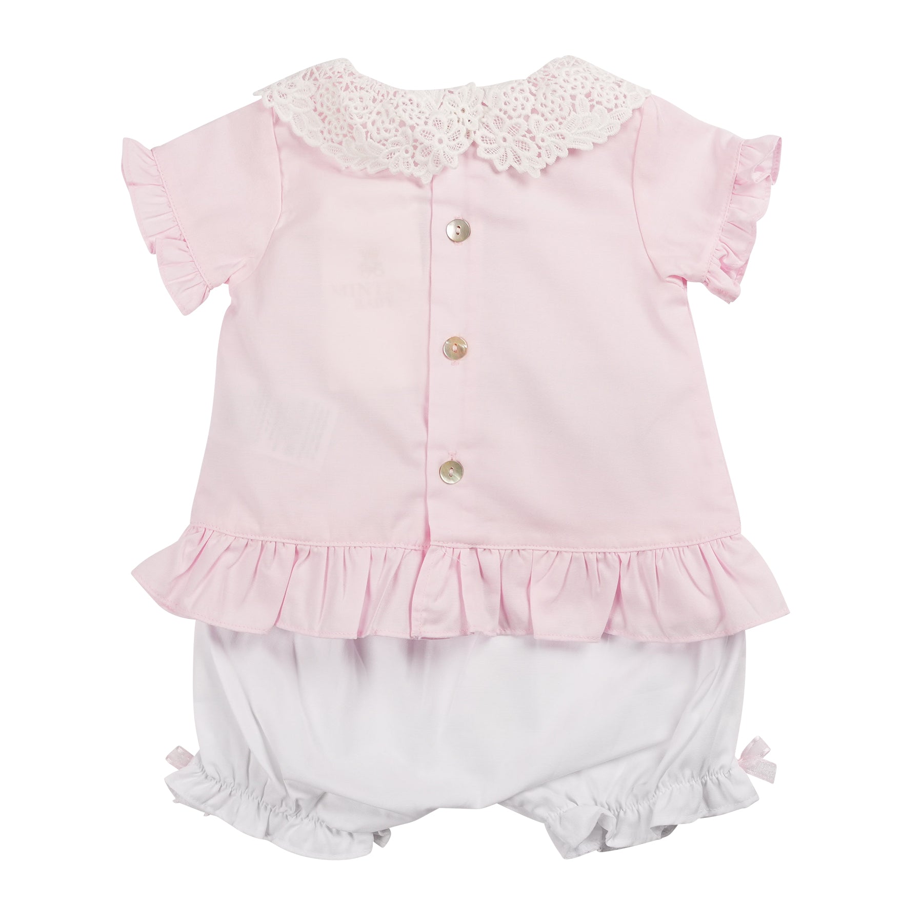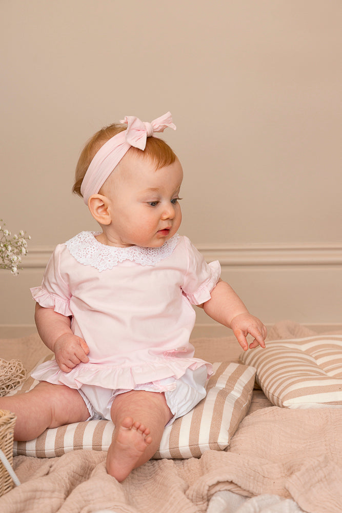 The Pink Broderie Collar Top and Bloomer from our SS25 collection is a must-have for your little one's wardrobe. Made from 100% soft cotton, the pink top features a delicate broderie collar for a charming touch, while the white bloomers add a crisp, fresh look. Perfect for warm weather, this set combines comfort, style, and elegance, making it an ideal choice for your little one this season.