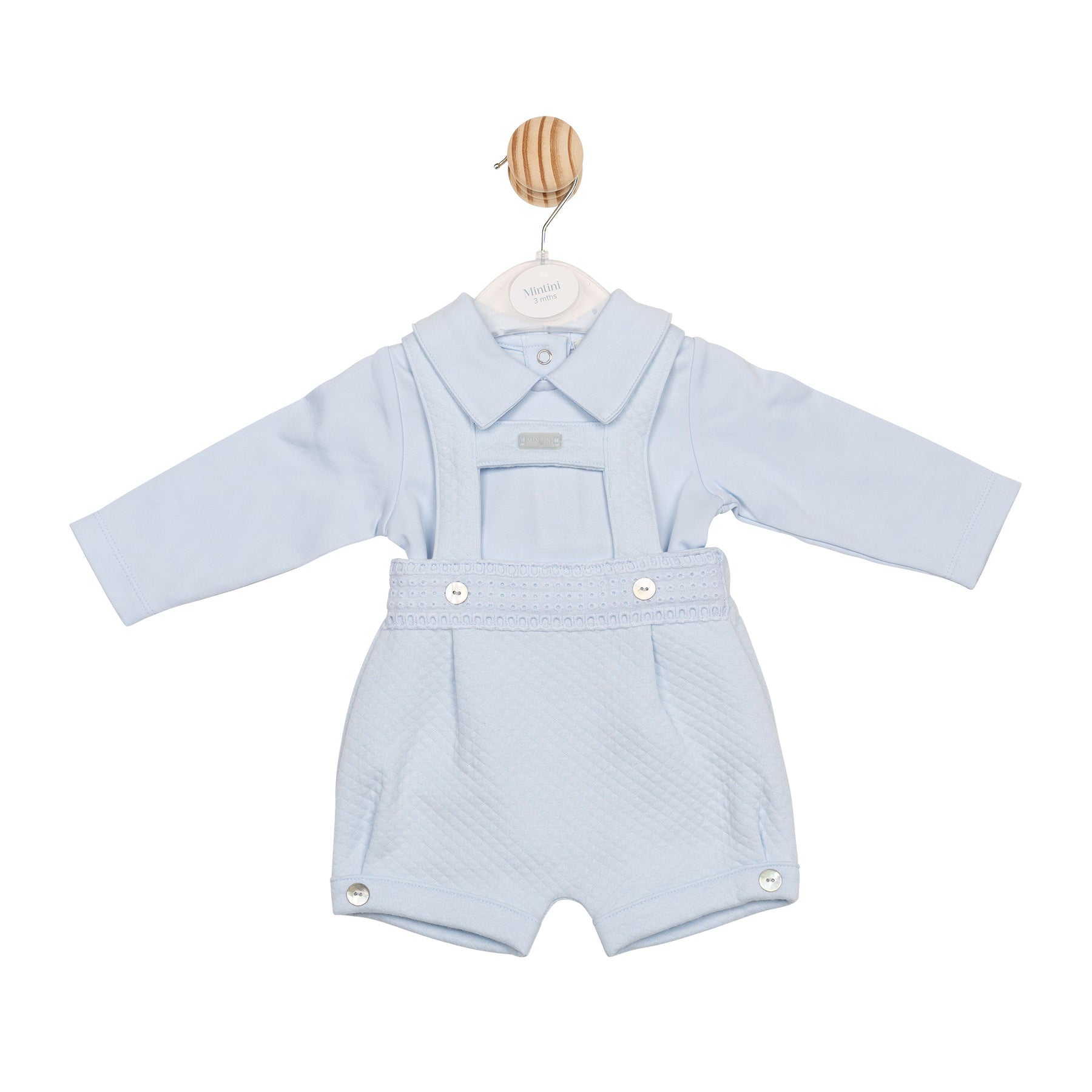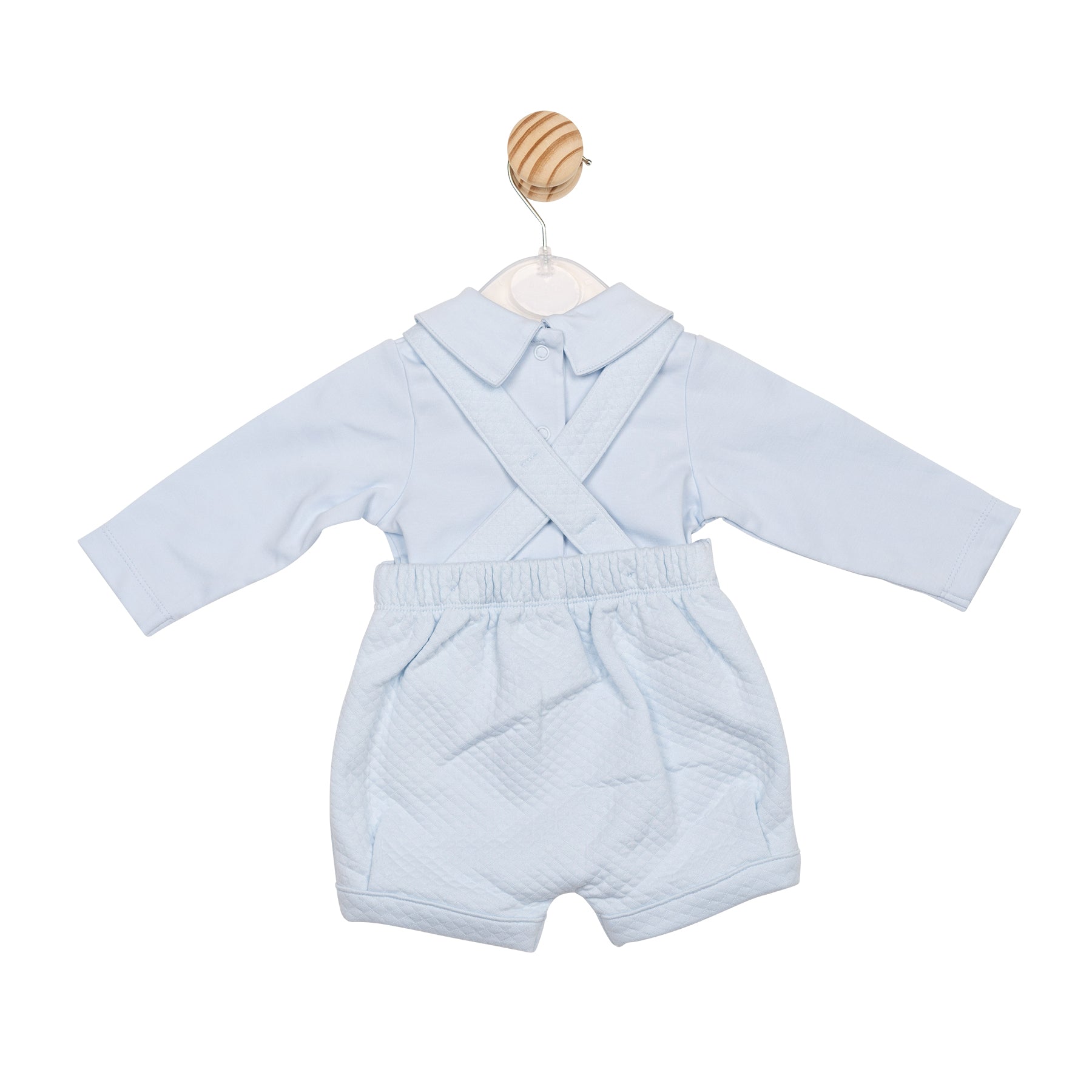 This adorable Blue Jacquard Dungaree Romper Set features a soft cotton top with a smart Peter Pan collar, paired with textured waffle jacquard dungaree-style shorts. Detailed with a decorative stitched waistband and pearly button accents, it blends classic charm with modern comfort. The short-style bottoms are both breathable and stylish, making it perfect for special outings or everyday wear. A timeless piece for baby boys, offering both elegance and ease in one beautifully crafted outfit.