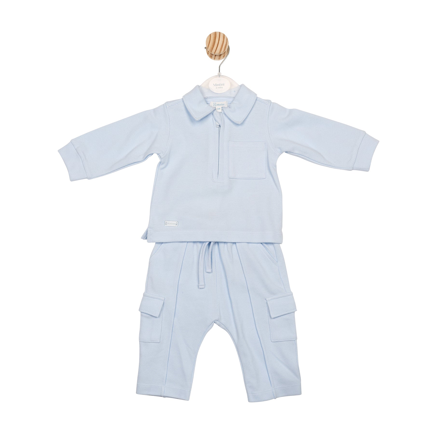 Keep your little one cosy and stylish with our Pique Knit Top and Trouser set in soft baby blue. Made from 100% cotton, the long-sleeve top features a practical zip front and a textured chest pocket for added charm. The matching trousers are designed with comfortable fit and finished with coordinating pique knit pocket detailing. Ideal for everyday wear or outings, this set offers a perfect blend of comfort, style, and ease for growing babies.