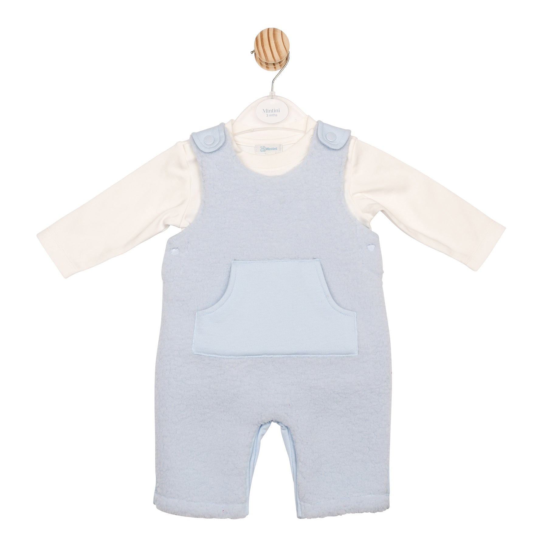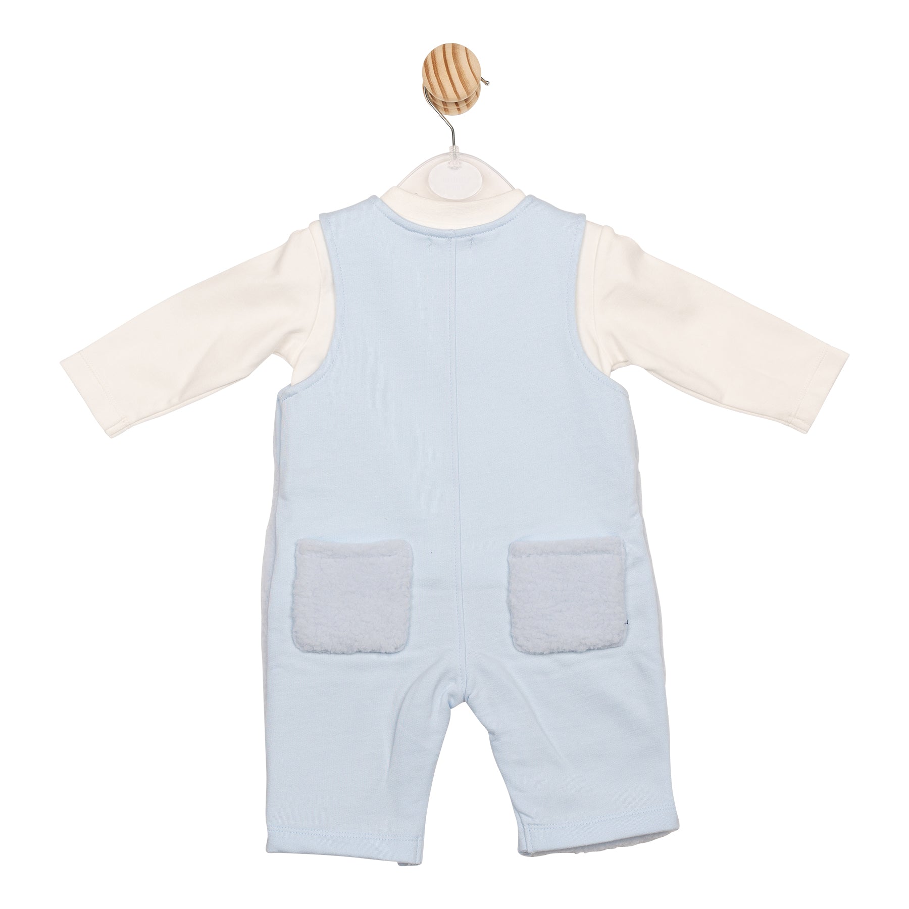 This cosy outfit features a 100% cotton white long-sleeve tee paired with a soft teddy fleece dungaree in blue. The dungaree fastens at the top with buttons for easy wear and includes a plain cotton kangaroo-style pocket on the front. The back is made of plain blue cotton with two fleecy pockets that perfectly match the front, combining comfort and style effortlessly—ideal for keeping little ones warm and stylish all day long.