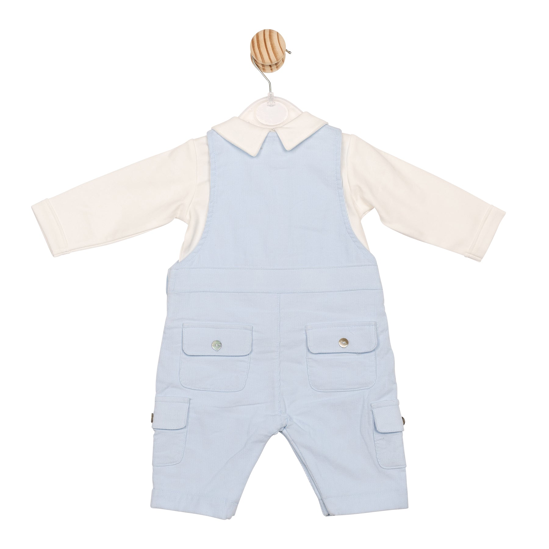 This smart outfit includes a plain white collared tee paired with a blue cord dungaree. The dungaree features a chest pocket and practical cargo pockets on either side of the legs. Finished with classic pearly buttons, this set combines style and functionality, perfect for everyday wear.