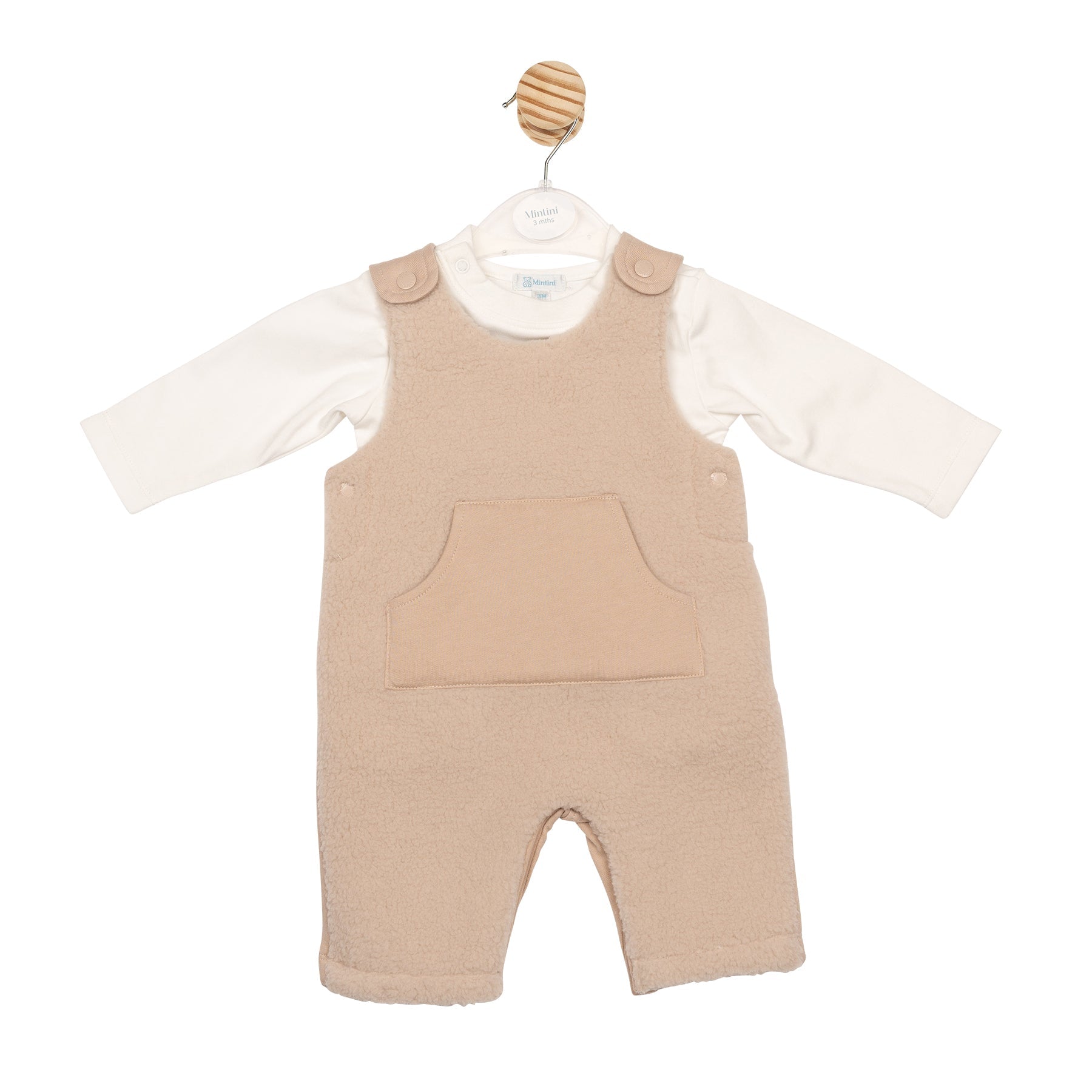 This cosy outfit pairs a 100% cotton white long-sleeve top with a soft teddy fleece dungaree in beige. The dungaree features button fastenings at the shoulders for easy dressing and a plain cotton kangaroo-style pocket on the front for added charm. The back is finished in smooth beige cotton with two matching fleece pockets, blending comfort and style effortlessly. Perfect for keeping little ones warm and adorable all day long.