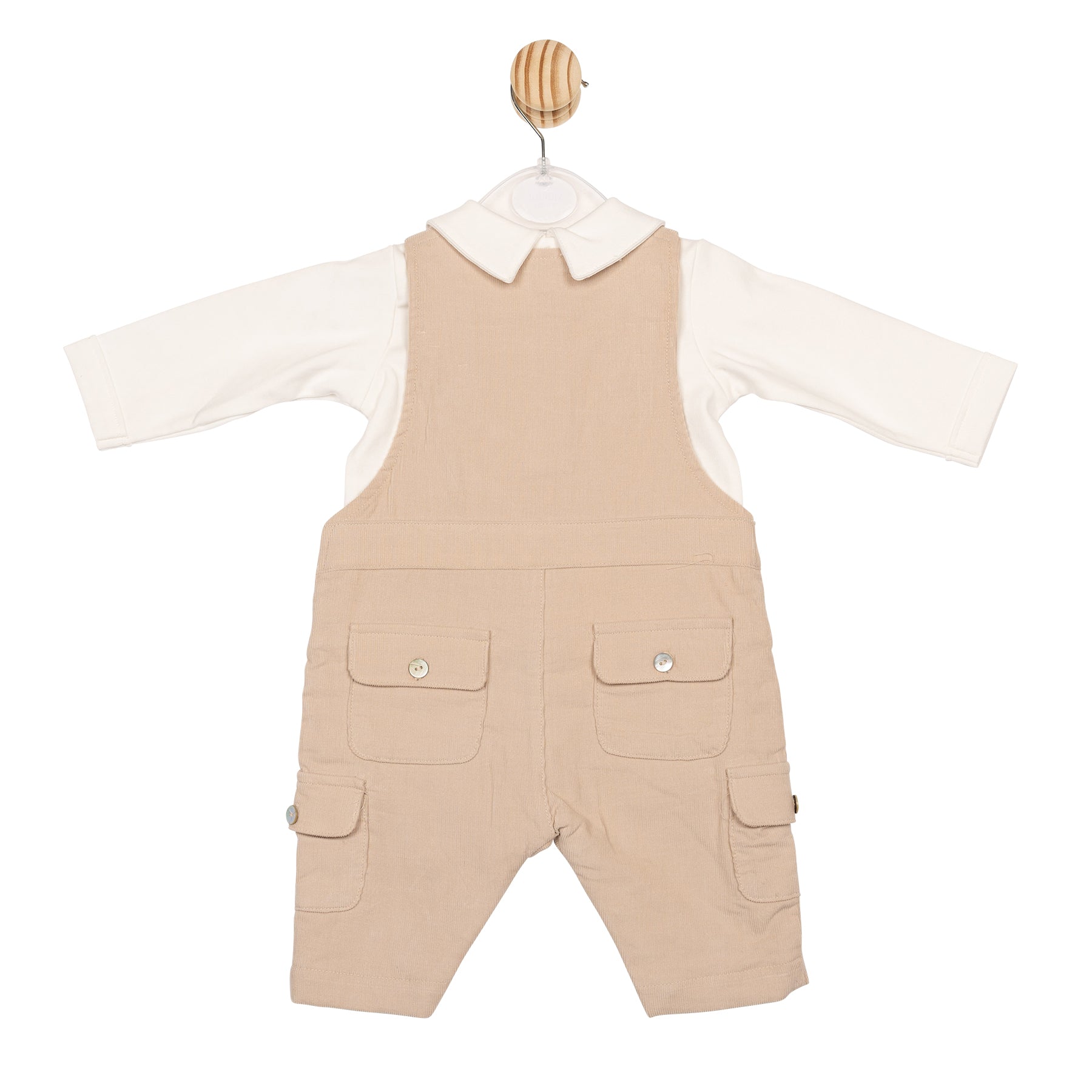 This smart outfit for babies and toddlers features a crisp white collared top paired with a beige corduroy dungaree. The dungaree includes a chest pocket and handy cargo-style pockets on either side of the legs, offering both charm and practicality. Finished with classic pearly buttons, this set blends timeless style with everyday comfort—perfect for little ones on the move.