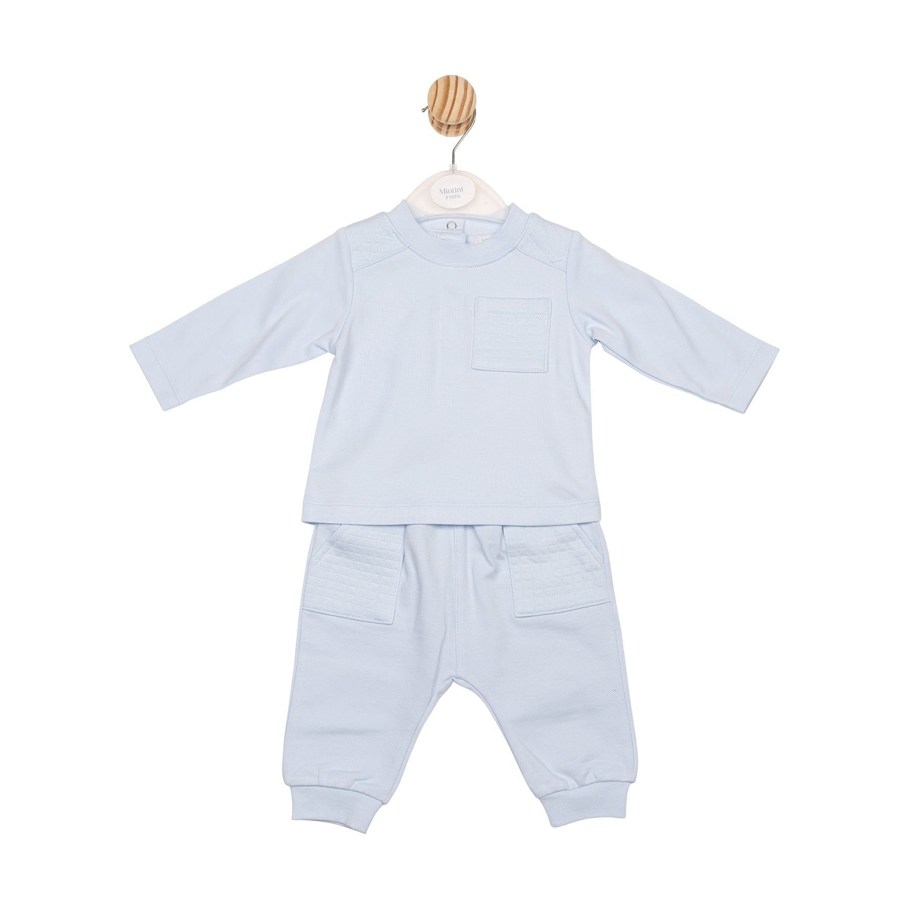 The Blue Square Jacquard Top and Jogpant set, part of our Square Jacquard Collection, is designed for babies to toddlers. The baby blue cotton long sleeve top features quilted square jacquard accents on the chest pocket and shoulder patches, adding a touch of texture and charm. Paired with matching cuffed joggers, complete with quilted front pockets and zip pockets on the back, this set combines comfort and practicality with a stylish twist—perfect for play, outings, or cosy days at home.