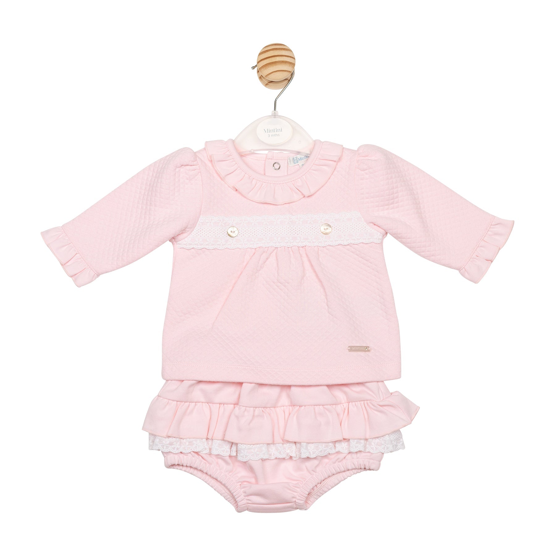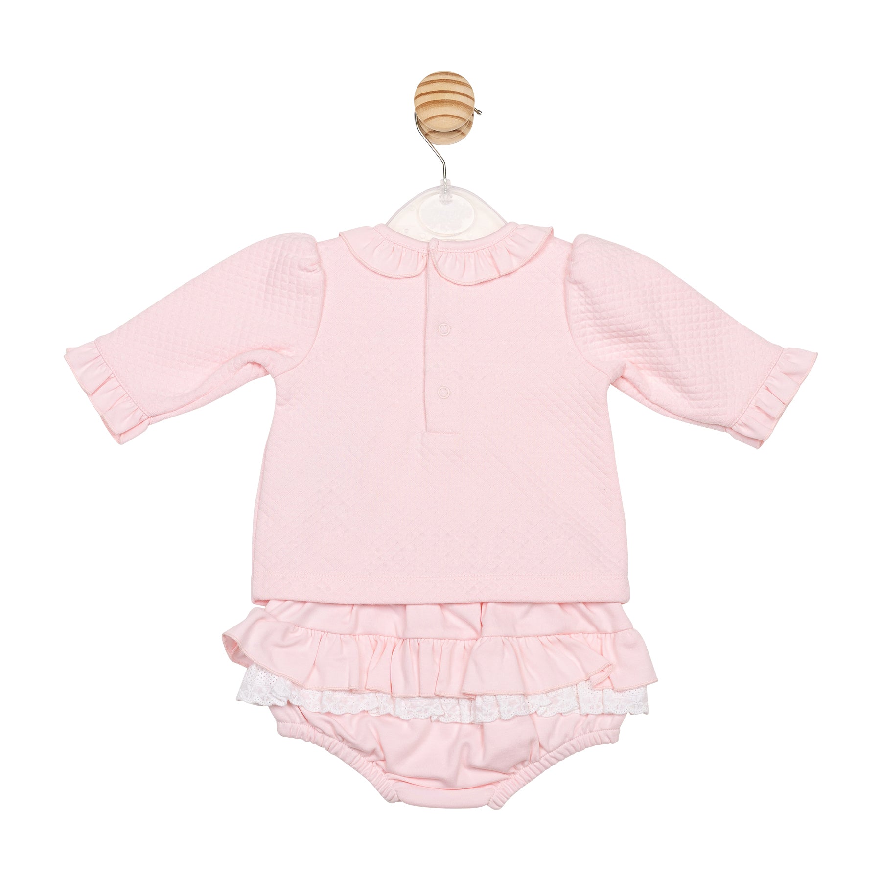 Add a touch of elegance to your baby’s wardrobe with our Pink Diamond Jacquard Dress and Jam Pant set, designed for ages 3 to 12 months. The dress features a soft quilted diamanté pink top with a frilly collar and sleeves, and a delicate lace smocking band across the chest. Paired with matching pink jam pants, the set is finished with layered pink frills over a coordinating lace tier that mirrors the dress detailing—perfect for special moments and everyday charm.