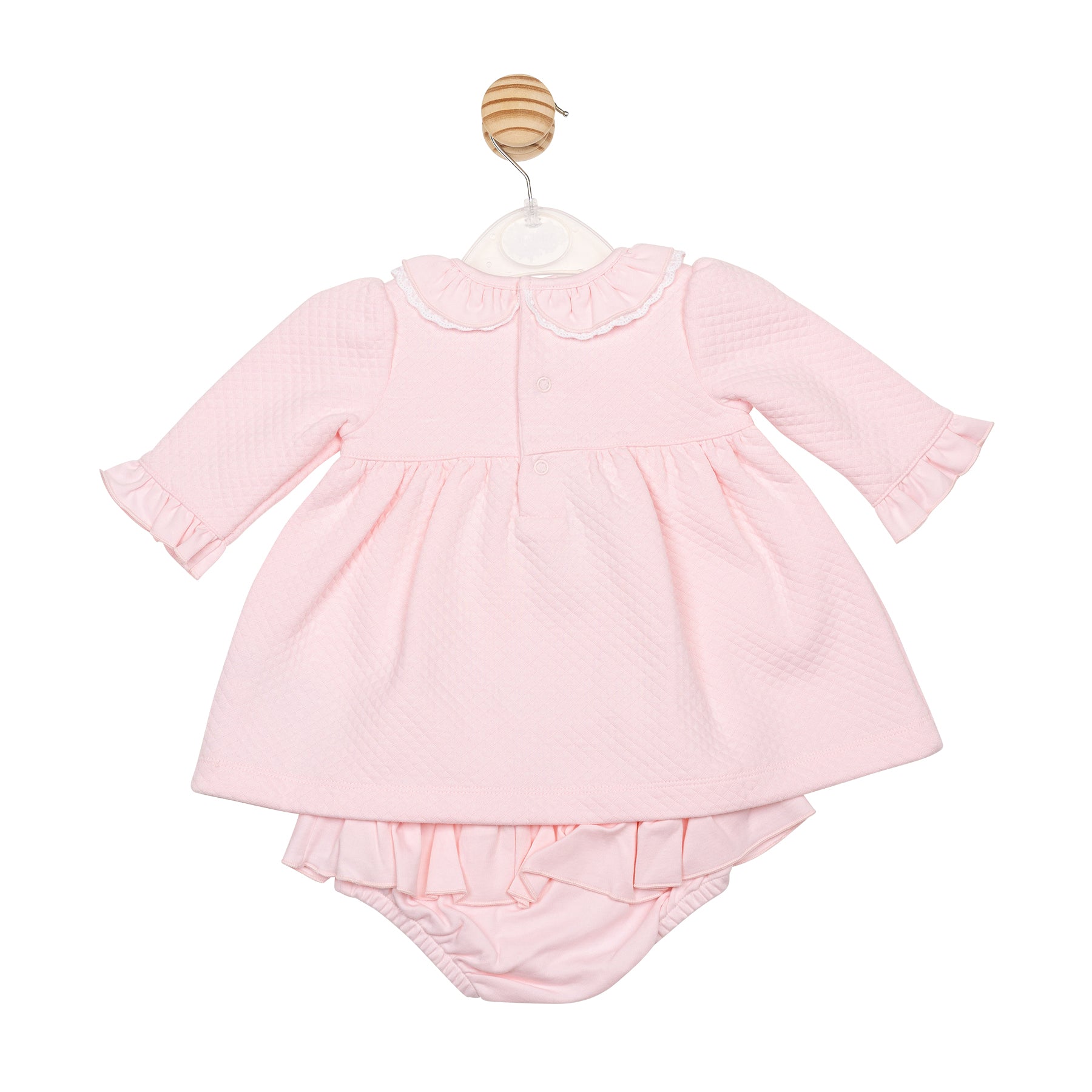 Our Pink Diamond Jacquard Dress and Knicker set is a sweet and stylish choice for little ones. Made from soft pink quilted fabric, the dress features frilly sleeves and a delicate pink collar trimmed in white for a classic touch. Coordinating frilly pink knickers are included to comfortably cover nappies while adding extra charm. Perfect for special occasions or everyday elegance, this set combines comfort and timeless design for babies aged 3 to 12 months.