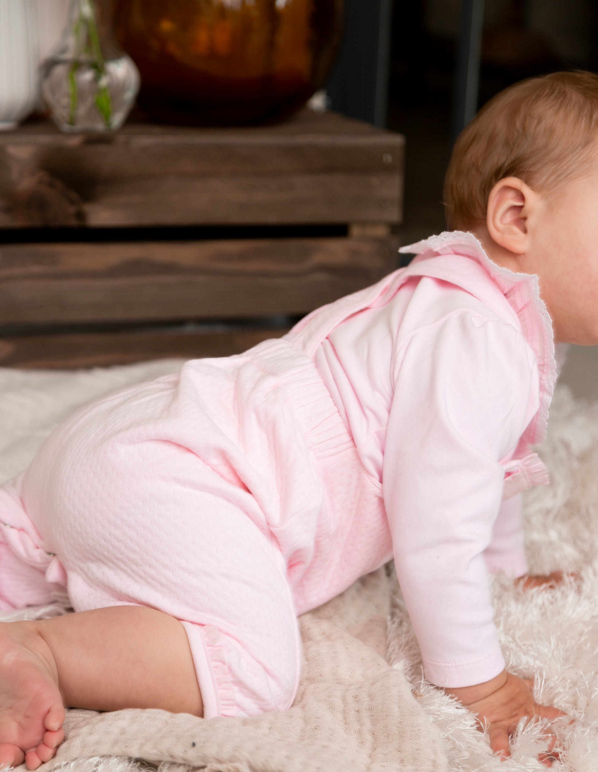 The Pointelle Jacquard Top and Dungaree set is a beautifully classic outfit for little ones. The soft pink long-sleeved top features a delicate ruffled pointelle collar, layered beneath a matching pink pointelle dungaree. Pretty ruffle detailing on the chest and pearly buttons add a touch of charm, while white lacy bows by the feet give a sweet finishing touch. Perfect for everyday wear or special occasions, this set offers comfort with timeless style.