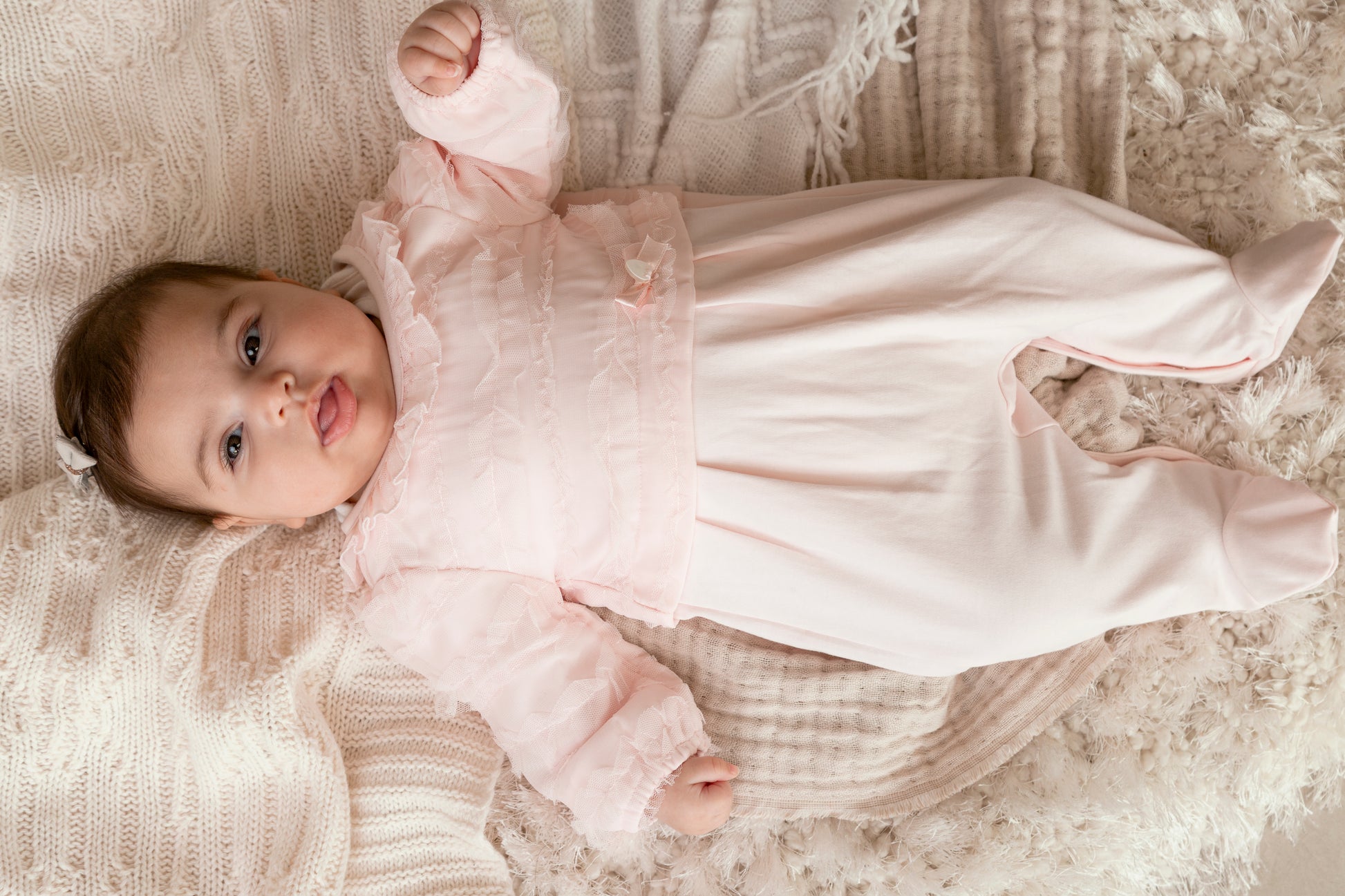 This Pink Ruffle Babygrow is a delicate and charming outfit for your little one. Crafted from soft, gentle fabric, it features a beautifully textured ruffle pattern across the bodice and sleeves. The ruffled collar adds a sweet, classic touch, while the long sleeves ensure warmth and comfort. Designed with built-in feet for cosy wear, this babygrow combines elegance and practicality, making it perfect for special occasions or everyday use. Ideal for babies who deserve both style and softness.