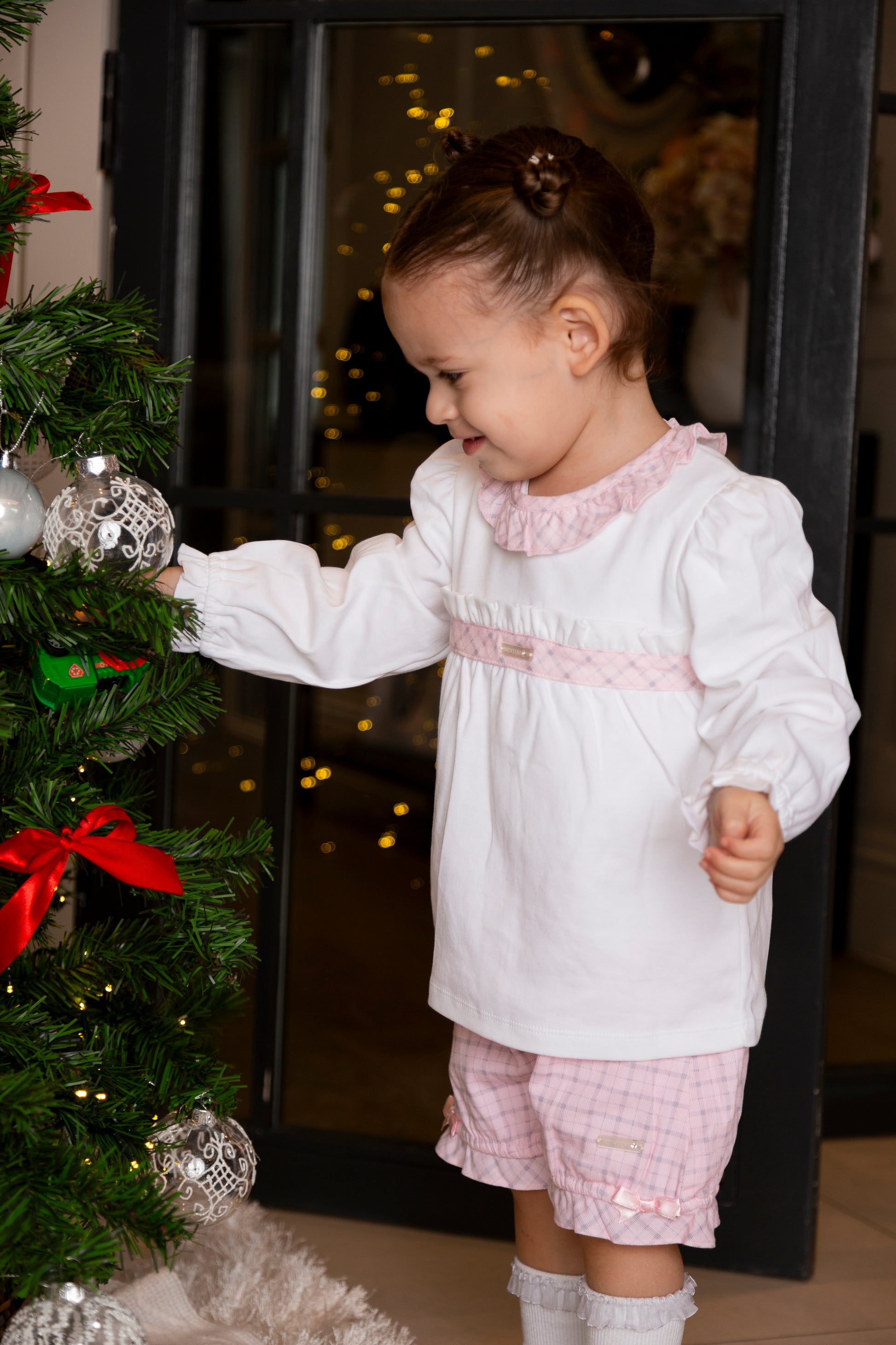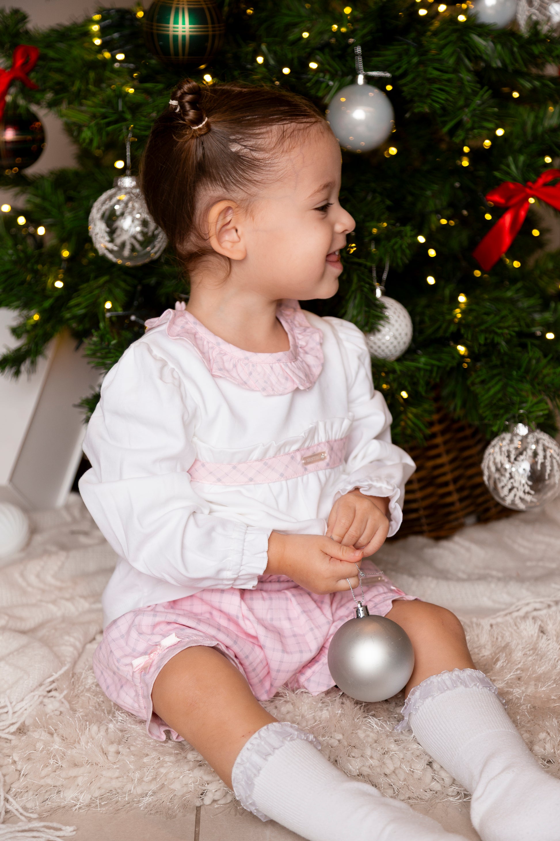 The Pink Check Top and Bloomer set is a sweet, seasonal ensemble full of delicate detail. The flared top features white balloon sleeves and a soft pink smocked band across the chest, paired with a matching smocked collar for a classic, elegant touch. Coordinating pink check bloomer shorts complete the look, finished with dainty pink ribbon bows for added charm. Comfortable yet stylish, this set is perfect for special occasions or cosy days with a touch of flair.