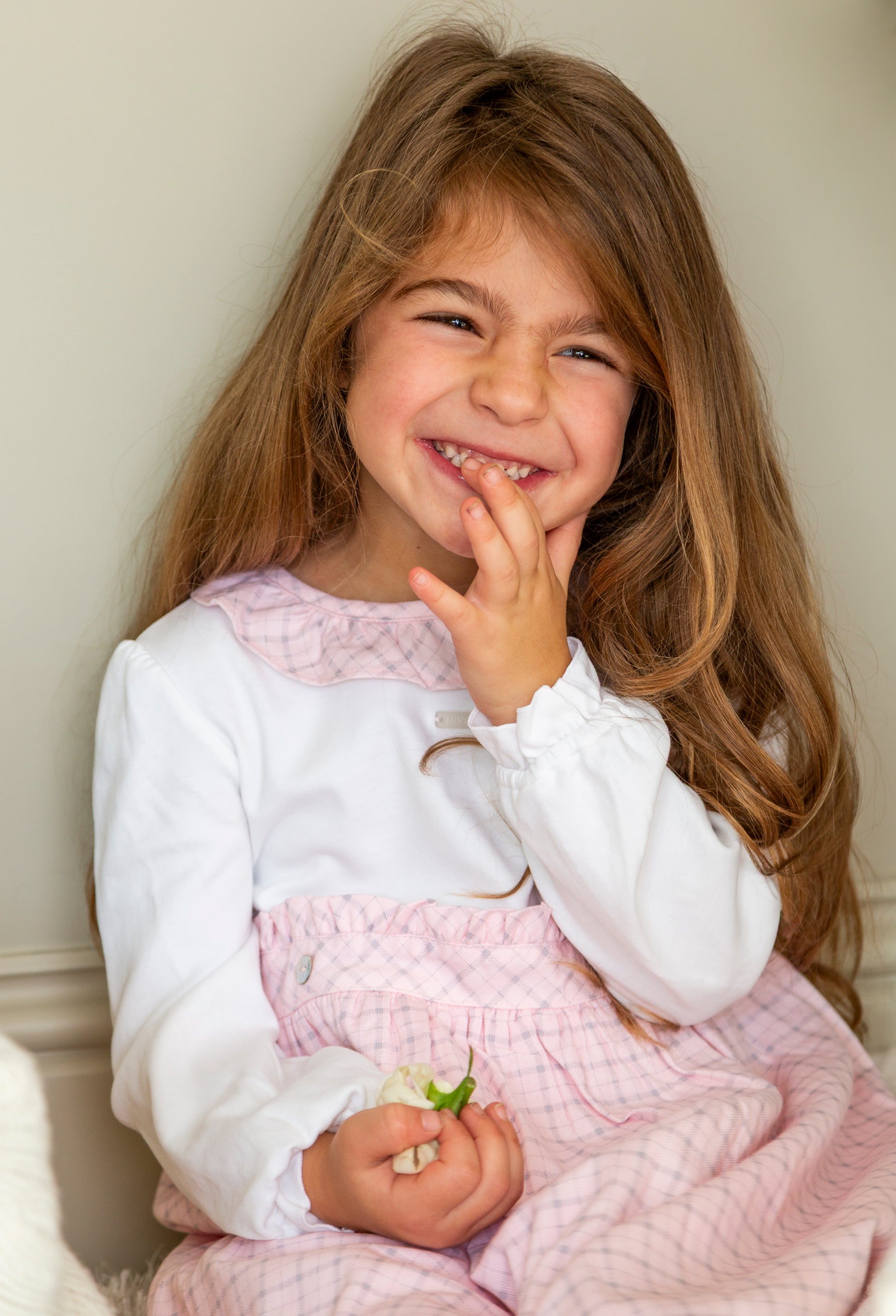 The Pink Check Dress is a classic and coSy outfit for babies and toddlers. Featuring a soft white bodice with long balloon sleeves and gentle ruffle cuffs, it’s beautifully accented by a pink and grey checked skirt and matching frilled collar. Delicate pearly buttons and a ruffled waistband add charm and detail, making it perfect for seasonal wear. Crafted from soft, breathable fabric, this dress combines timeless style with everyday comfort for your little one.