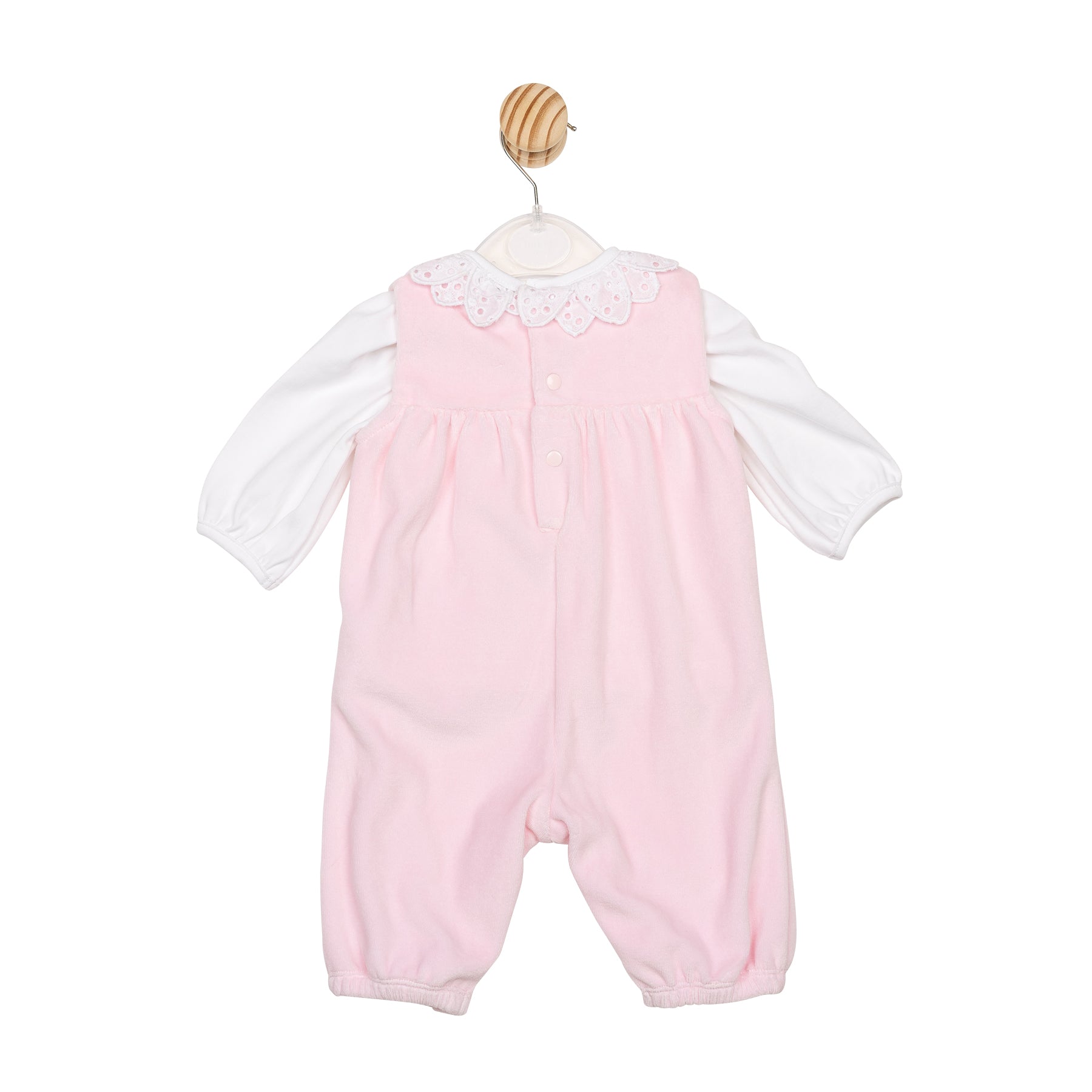 The Petal Velour Top and Dungaree set is a timeless outfit for babies and toddlers, crafted from 100% cotton for softness and ease. The set includes a plain white balloon-sleeve top featuring our signature petal collar for a sweet, elegant finish. Layered over it is a plain pink velour dungaree, offering a cosy feel and a classic look, complete with popper fastenings at the back for easy changing. Perfect for everyday wear with a touch of charm.