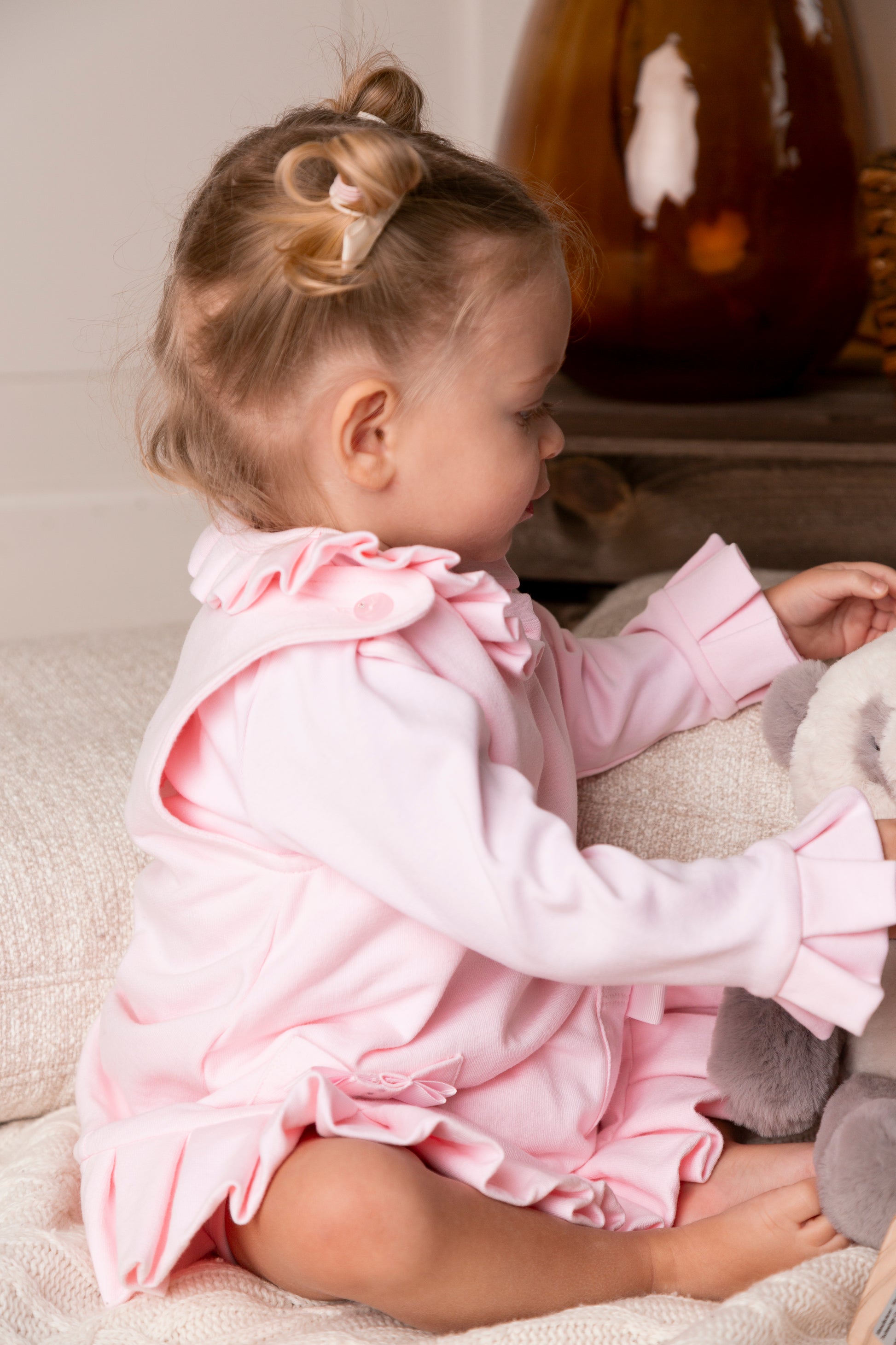 The Ribbon Pleat Top and Pinafore set is a beautifully coordinated outfit for babies and toddlers. Made from 100% cotton, the long-sleeve pink top features a pleated collar and frilly pleated sleeve hems for a soft, elegant touch. Layered over it, the matching pinafore includes shoulder buttons, a pleated frilly trim, and two front pockets adorned with pleats and sparkling diamanté details. Part of our Ribbon Pleat Collection, this timeless set blends comfort with charming, classic style.