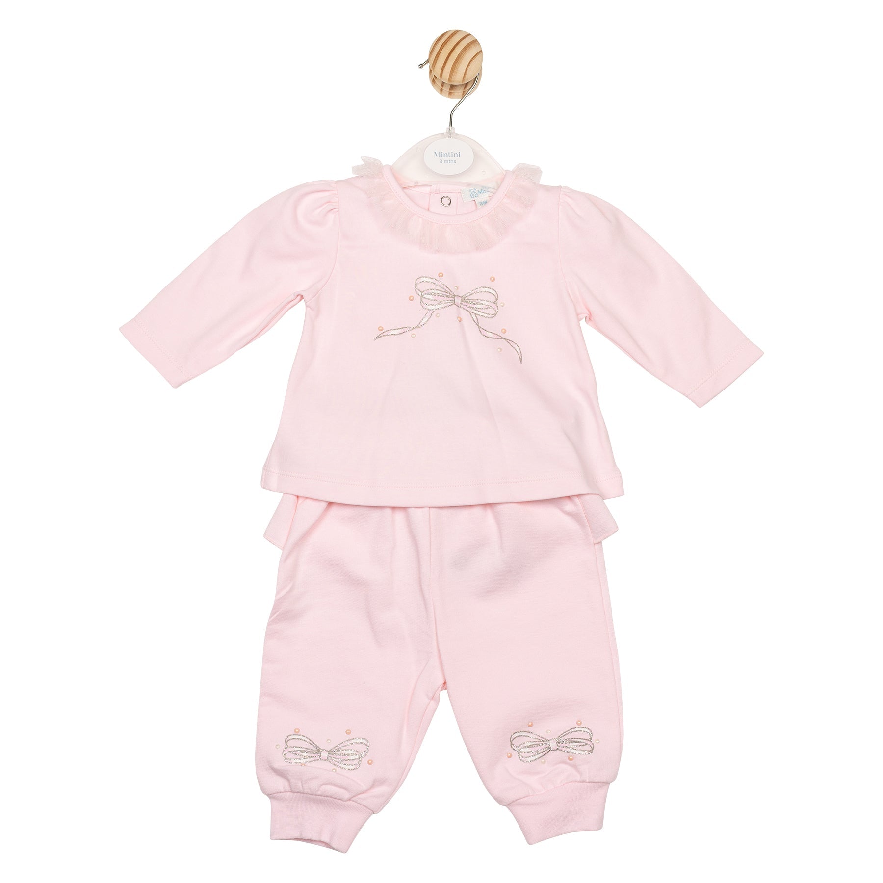 The Ballet Bow Tracksuit is a delightful set for children aged 3 months to 5 years, crafted from 100% soft cotton for all-day comfort. The pink long-sleeve top features the classic glittery bow graphic with pearl accents on the front, finished with a charming tulle collar for an elegant touch. Matching cuffed jogging bottoms showcase the same bow graphic on the lower leg and a playful ruffle pleat wrapping around the backside, blending style and cosiness perfectly.
