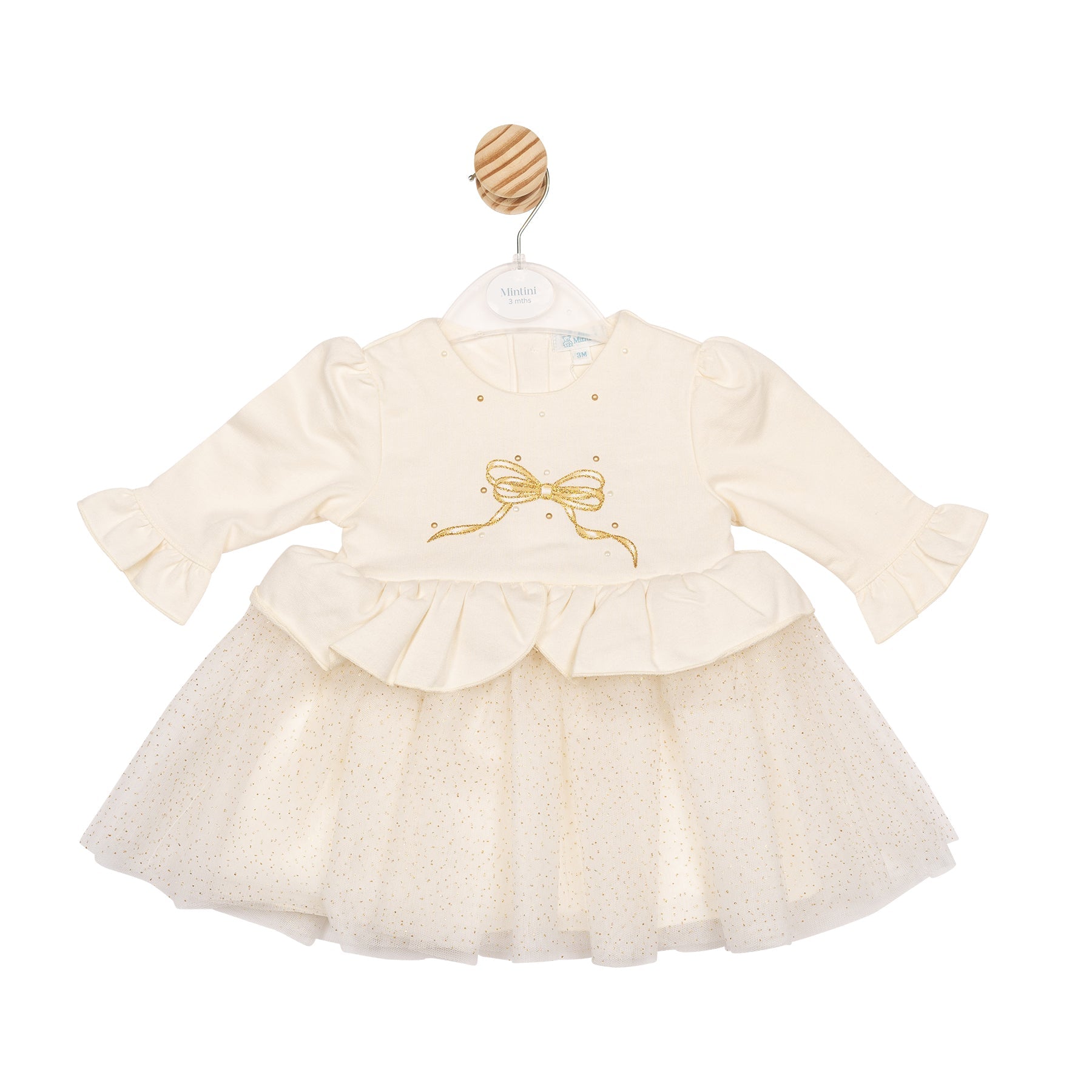 The Vanilla Bow Tulle Dress is a stunning outfit designed for children aged 3 months to 5 years. Crafted from 100% cotton in a gentle cream shade, it showcases charming frilled sleeves and a delicate bow motif embellished with pearls on the chest. The dress features a softly gathered waistline that flows into a full, layered tulle skirt, adding volume and a subtle shimmer throughout. Finished with a dainty bow at the back, this dress is perfect for festive occasions or special winter events.