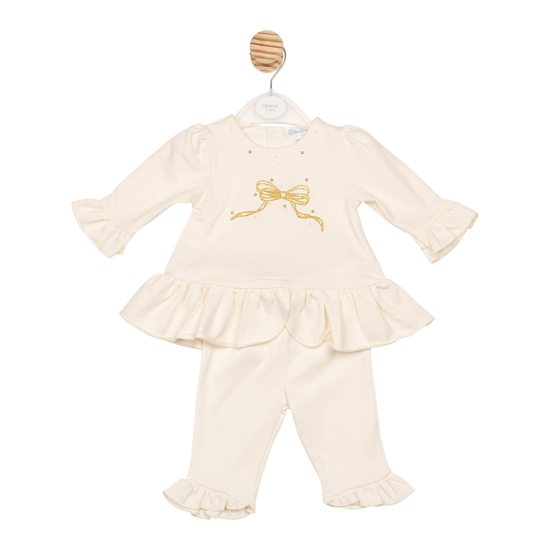 The Vanilla Bow Tunic and Legging set offers a delightful look for children aged 3 months to 5 years. Crafted from 100% soft cotton in a creamy hue, the tunic is decorated with a shimmering bow design accented by tiny pearls for a subtle sparkle. Frilled edges on the sleeves and hem add a playful, elegant touch, while the coordinating leggings, featuring matching frill details, complete this comfortable and stylish ensemble—ideal for both casual days and special moments.