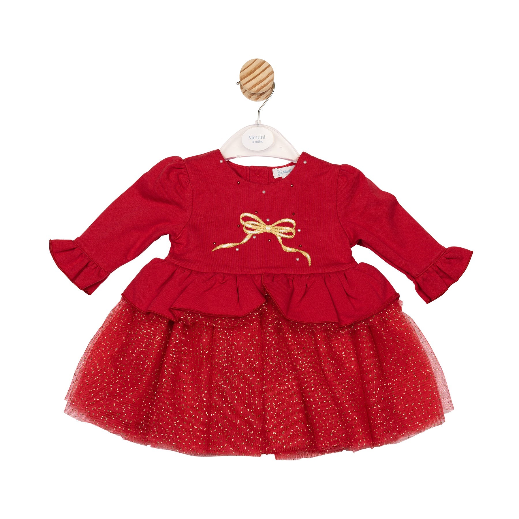 The Ruby Bow Tulle Dress is a stunning choice for little ones aged 3 months to 5 years. Made from 100% soft cotton in a deep, rich red, it features delicate frilled sleeves and a beautiful bow motif embellished with pearls on the chest. The dress has a gently gathered waist that flows into a full, layered tulle skirt, adding volume and a subtle shimmer throughout. Finished with a sweet bow at the back, this dress is perfect for special occasions and festive celebrations