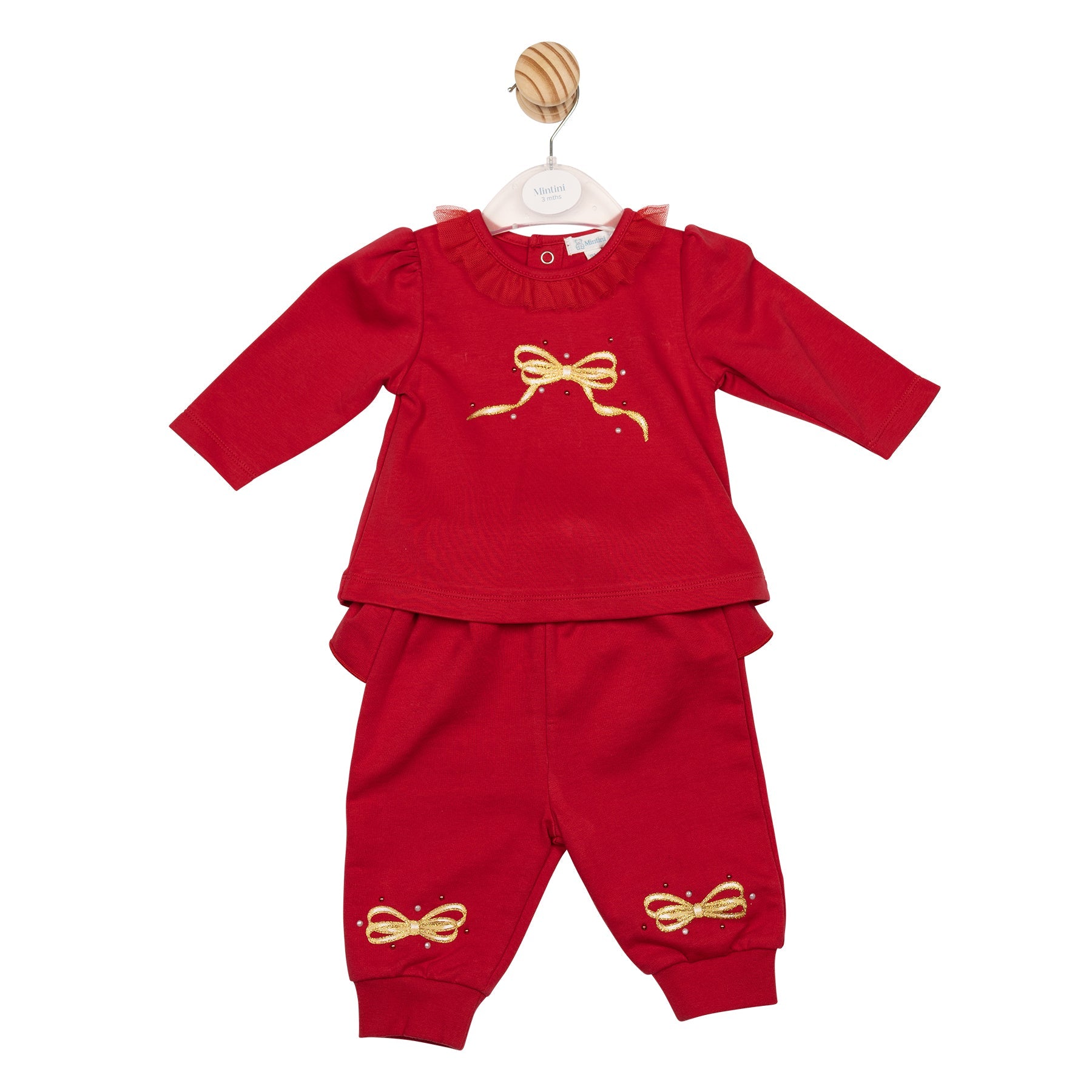The Ruby Bow Tracksuit is a cosy and stylish set for little ones aged 3 months to 5 years. Crafted from 100% soft cotton in a deep red shade, the long-sleeve top features a glittering bow graphic adorned with pearl accents on the front, finished with a delicate tulle collar for a refined touch. The matching cuffed joggers display the same bow detail near the ankle and a playful ruffle pleat wrapping around the back, blending comfort and elegance effortlessly.