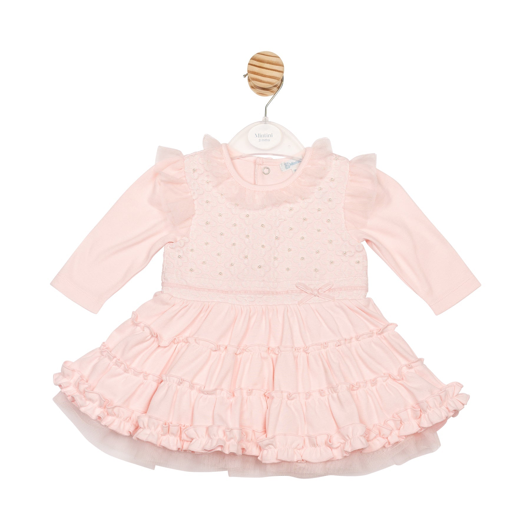 The Blush Interlock Dress is a beautifully detailed piece for little ones aged 3 months to 5 years. The top features a delicate jacquard bodice with subtle floral patterns and tiny pearl accents, complemented by soft tulle frills on the collar and sleeves. A velvet ribbon waistband with a sweet bow adds an elegant touch. The skirt falls into a soft rara-style tiered design, creating gentle volume and movement—perfect for winter occasions or dressing up in cosy seasonal style.