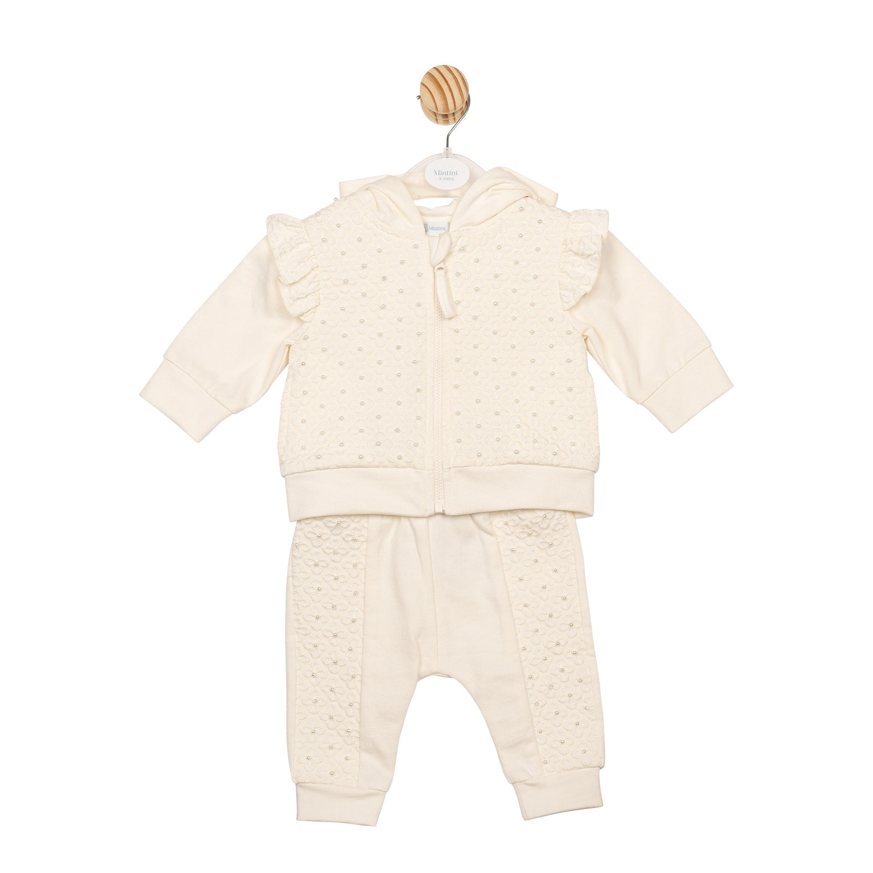 The Ivory Interlock Tracksuit is a snug yet stylish ensemble designed for babies and toddlers. The zip-front jacket features a floral jacquard interlock bodice decorated with subtle pearl accents, delicate frills on the shoulder seams, plain ivory cuffed sleeves, and a matching hood to keep little ones cosy. The coordinating joggers, crafted from soft ivory cotton, are finished with cuffed hems and adorned with floral jacquard panels embellished with pearls running down each leg—offering a perfect blend of comfort and gentle winter sparkle, ideal for everyday wear or festive adventures.