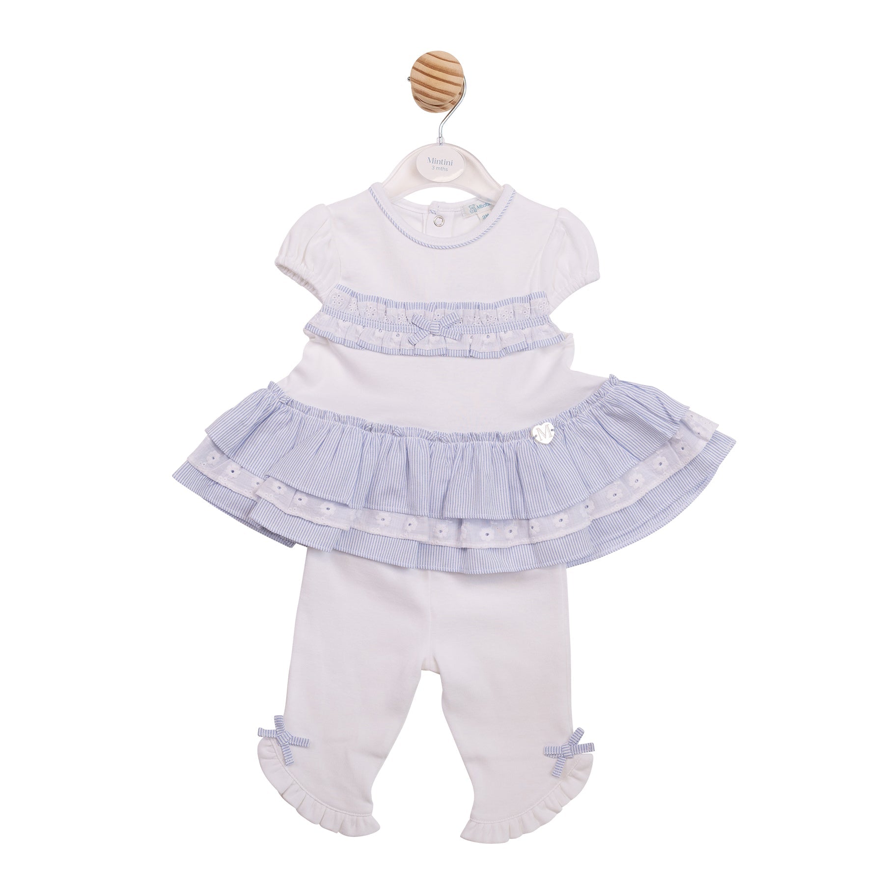 This set pairs a crisp white tunic with soft blue pinstripe accents and coordinating leggings for a comfortable, flexible fit. The tunic features gentle frill and bow details that give a playful, layered effect, while the leggings keep the outfit practical for everyday wear. Perfectly balanced, it combines soft textures with subtly decorative touches for a refined, yet fun look.