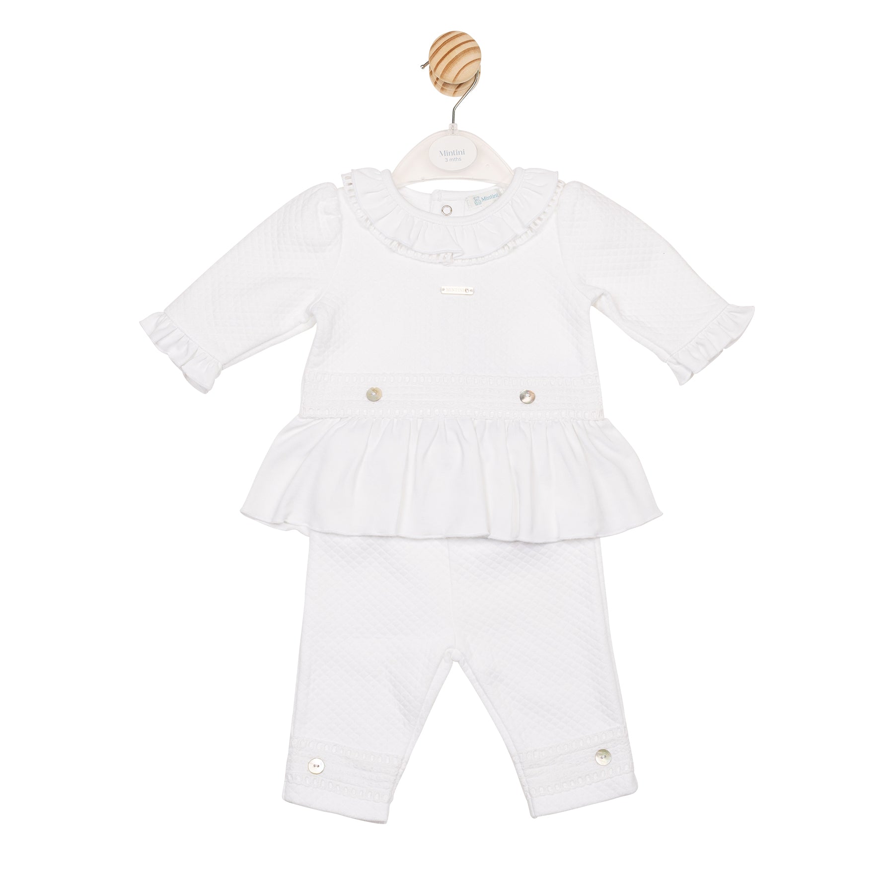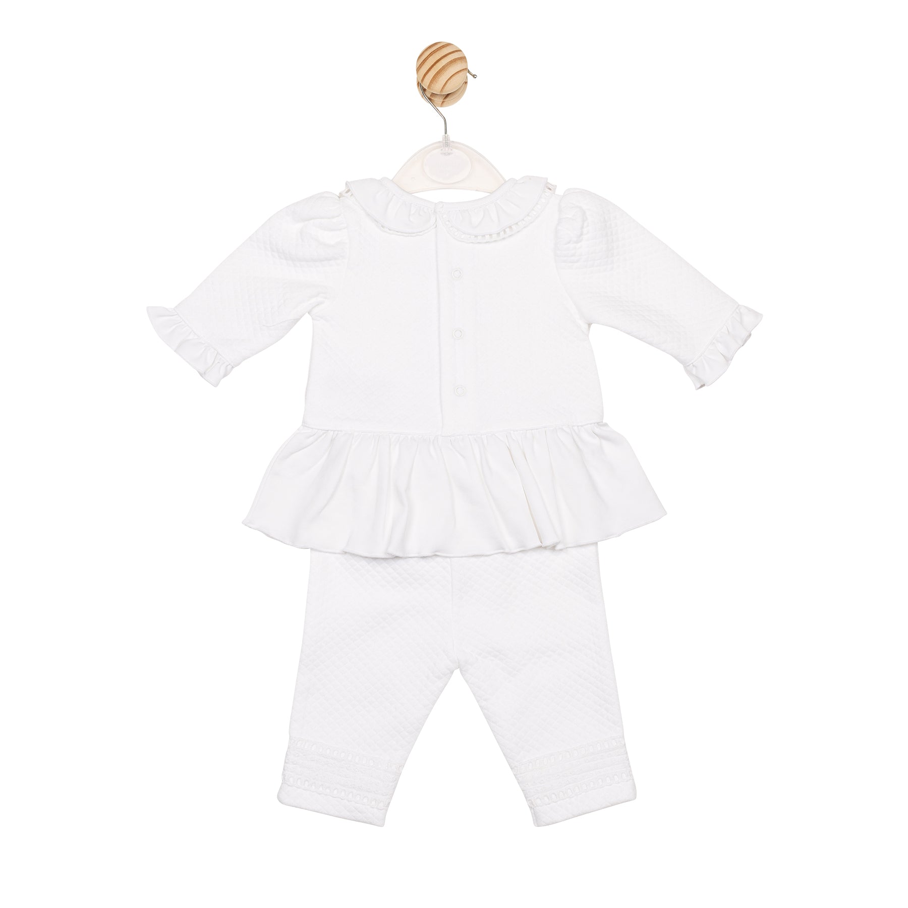 This White Jacquard Tunic and Legging features a stylish waffle texture crafted from a soft blend of 85% cotton and 15% polyester knit. The dress showcases elegant smocking detailing and delicate pearl button accents, adding a touch of charm. The matching leggings complement the look. Comfortable and breathable, this set is perfect for special occasions or everyday wear, combining classic design with modern comfort.